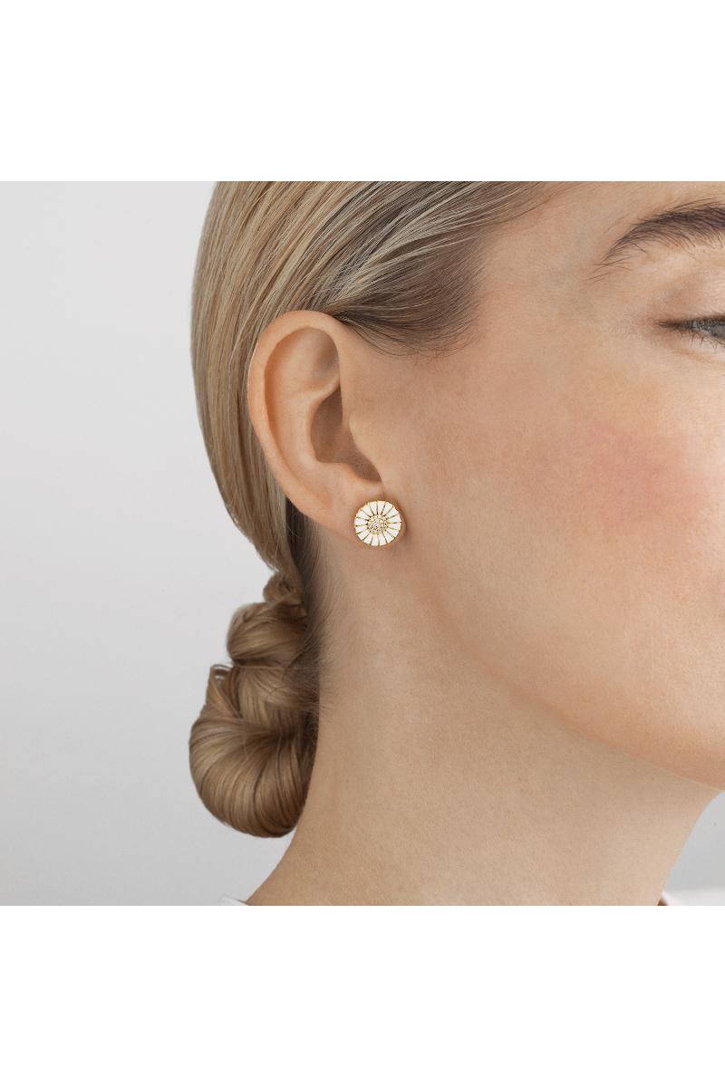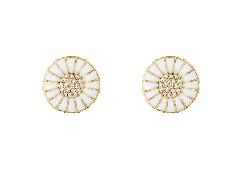 Øredobbene er laget av sterlingsølv og belagt med 18 KT gult gull og håndmalt med hvit emalje. Midten er fylt med brilliantslepne diamanter 0.10 ct.
