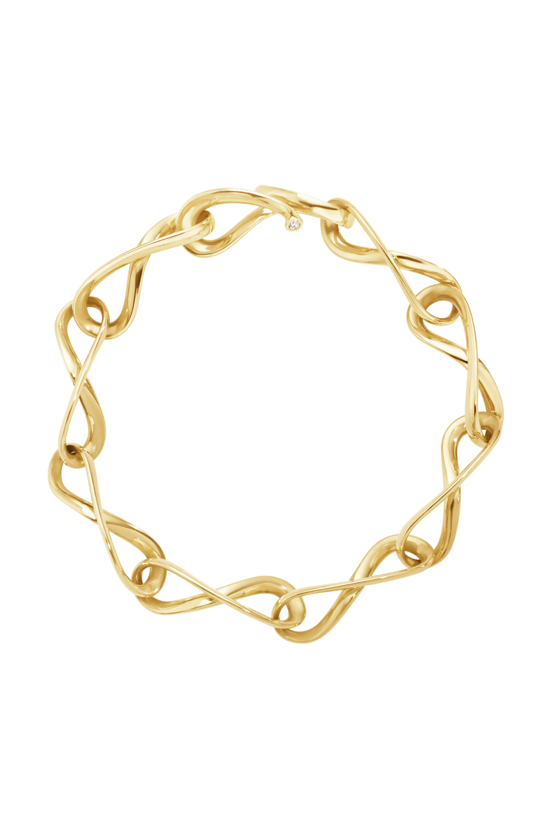Den anerkjente danske gullsmeden Regitze Overgaard har intrikat vevd den typen kjærlighet vi alle søker etter inn i selve armbåndet. Sensuelle, organiske former av tallet 8, det matematiske symbolet for uendelighet, er sammenføyd for å danne et virkelig unikt smykke.