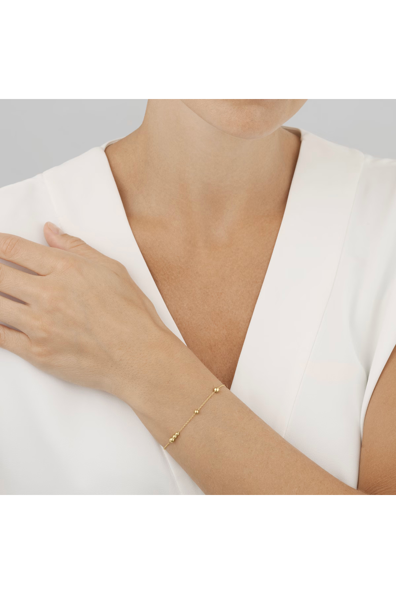 Dette delikate armbåndet er satt sammen av små perler i resirkulert 18 karat gull i ulike størrelser, festet til et elegant gullkjede. Det er et enkelt hverdagsarmbånd som kan brukes alene som en sofistikert detalj eller kombineres med andre favorittarmbånd.