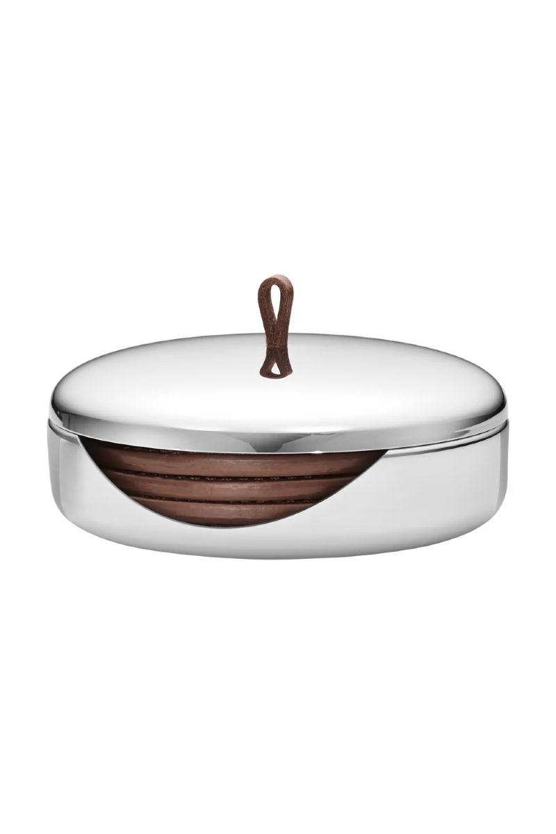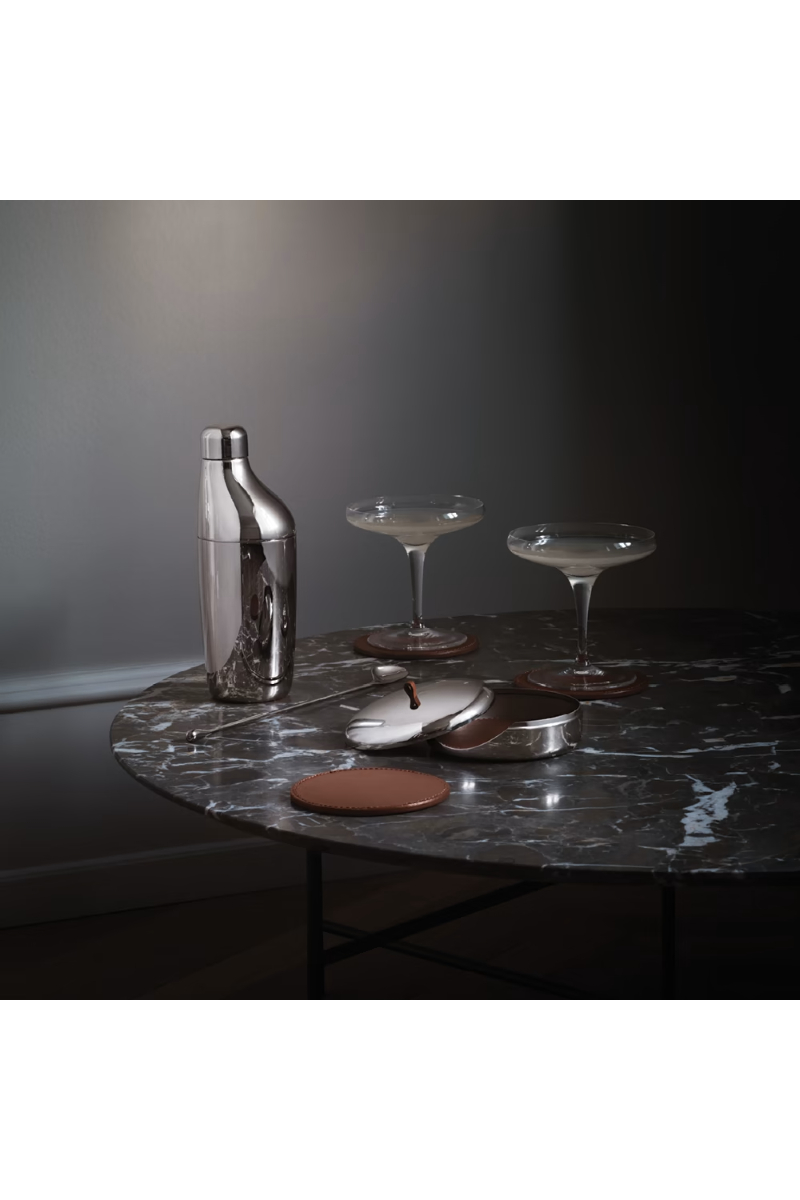 Med sin forlokkende, taktil form og moderne utseende, utgjør dette raffinerte settet med skinnbrikker i etui i rustfritt stål en iøynefallende detalj i enhver hjemmebar eller på salongbordet. Når de ikke er i bruk, kan de fire brikkene oppbevares praktisk og ryddig i etuiet med flotte sømmer og matchende håndtak i skinn. Dette settet er en gjennomtenkt gave til de som verdsetter elegant og moderne design i hjemmet.