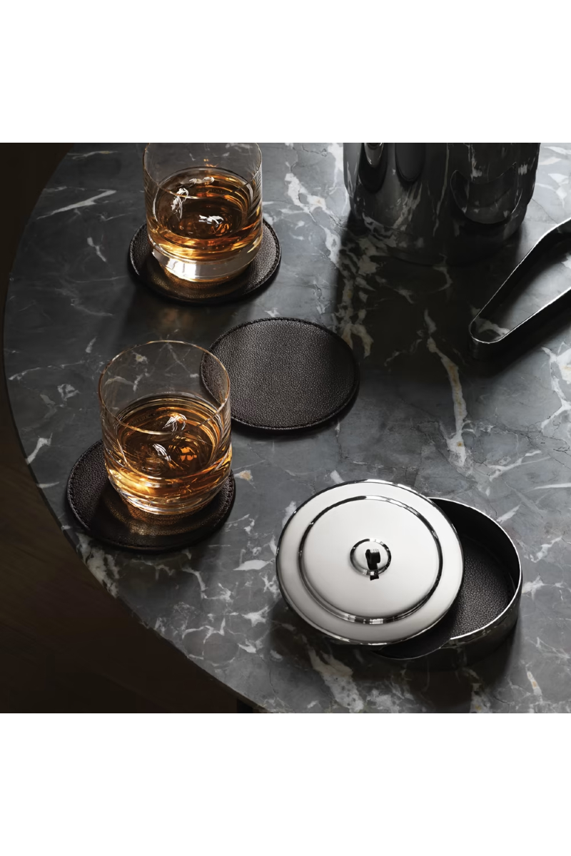 Dette settet med skinnbrikker bringer litt av glamouren og raffinementet fra Gatsby-æraen i New York inn i hjemmebaren, og utgjør den perfekte finishen. Lokket er inspirert av de geometriske detaljene du finner i Art Deco-arkitektur, og har et skinnhåndtak som matcher de fire lærmatene med sømmer. Settet er en ideell gave til de som verdsetter de mer eksklusive sidene av livet.