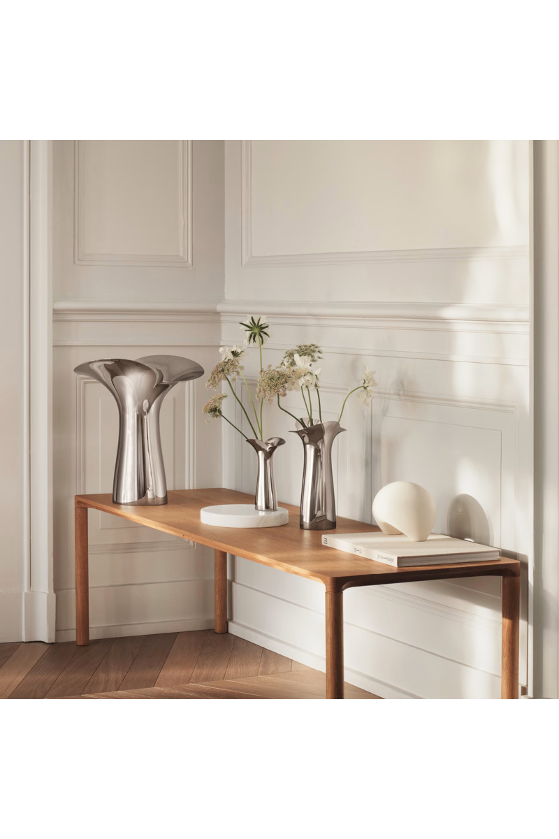 Denne lille vasen er ekspertmessig utført i rustfritt stål med en høyglanspolert finish.