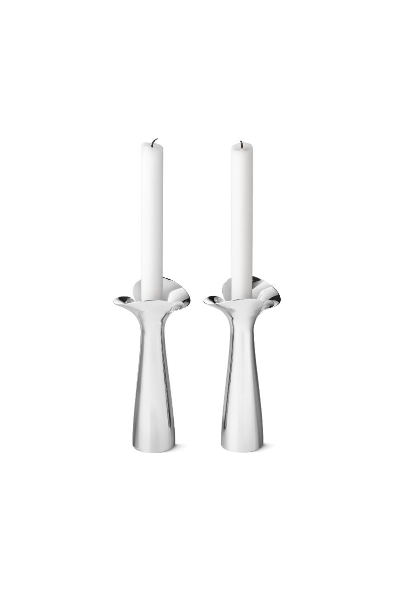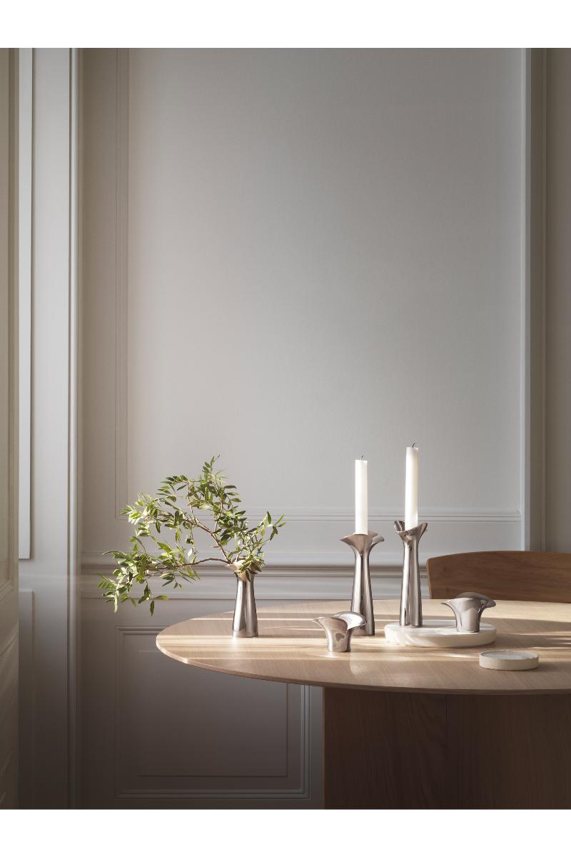 Disse to lysestakene har en frisk og lys kvalitet, inspirert av det øyeblikket om våren når nye kronblader springer ut av en blomsterknopp. De skulpturelle formene tar seg godt ut på spisebordet eller i vinduskarmen, og den blankpolerte overflaten reflekterer lyset og gir lysestakene et levende uttrykk.