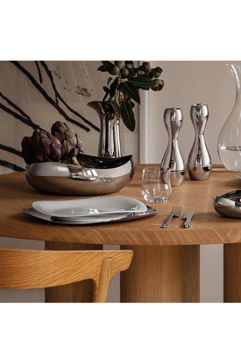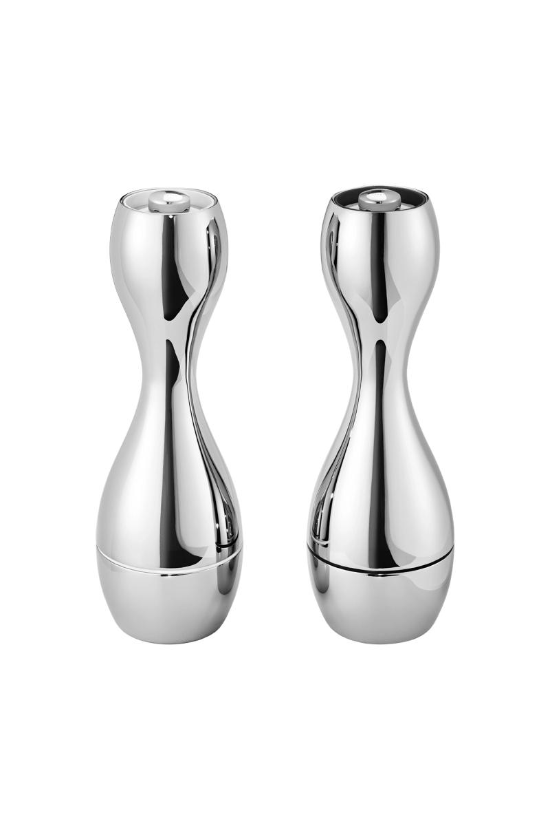 De ergonomiske og organiske formene gjør dette salt- og pepperkvernsettet i rustfritt stål til et flott tilskudd til bordet. Kvernene hviler komfortabelt i hendene når de brukes og er designet slik at salt og pepper kommer ut øverst for å unngå rester på bordet.