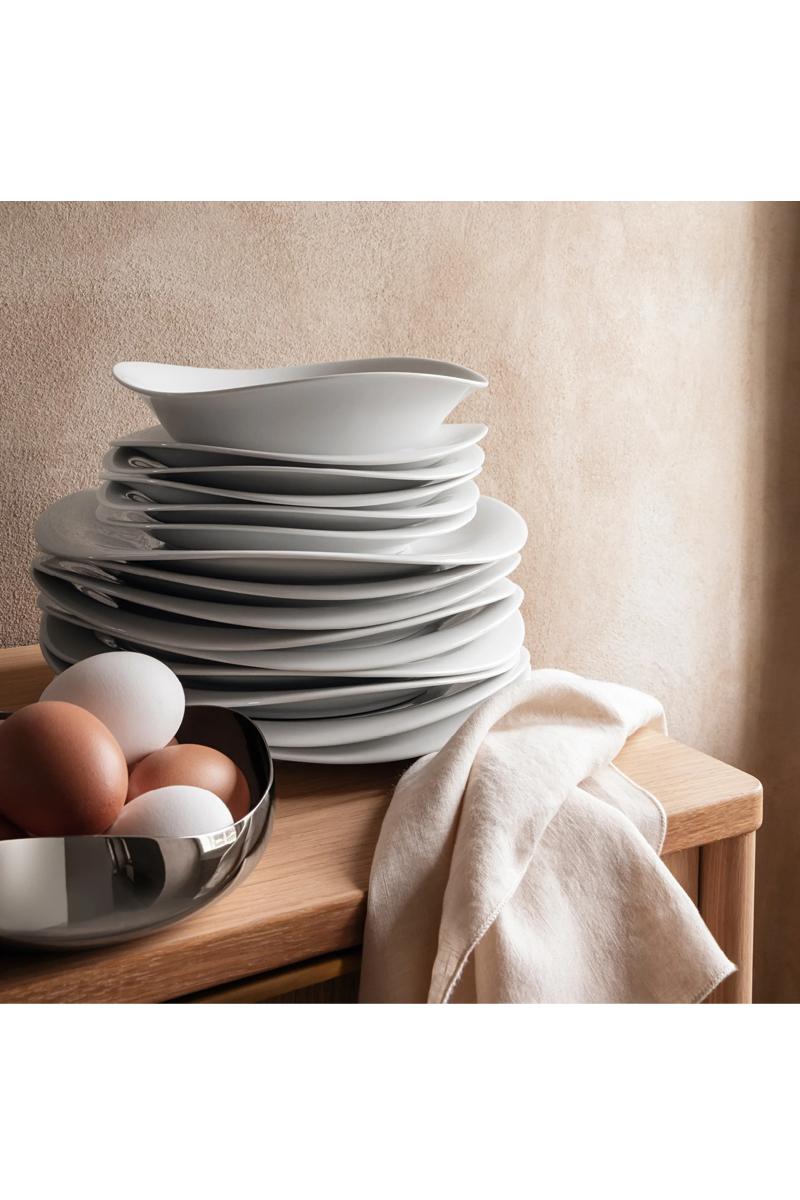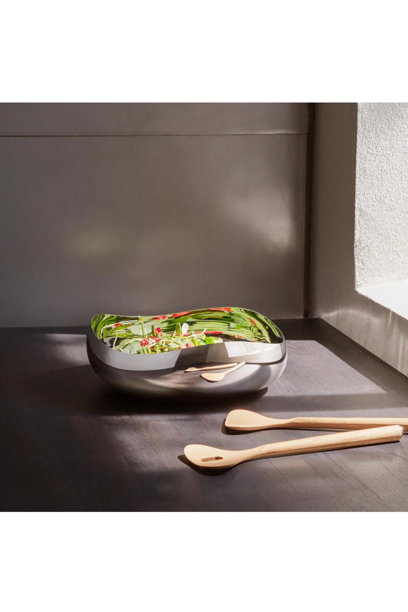 Med sin mykt kurvede og nesten flytende form gir denne mellomstore skålen i rustfritt stål en følelse av bevegelse som tiltrekker oppmerksomheten og skaper samtaleemner under middagsselskapet. Den har den perfekte størrelsen for å servere salater, ris eller grønnsaker, og den gir et moderne preg til måltidet, spesielt når den brukes sammen med andre skåler fra samme kolleksjon.