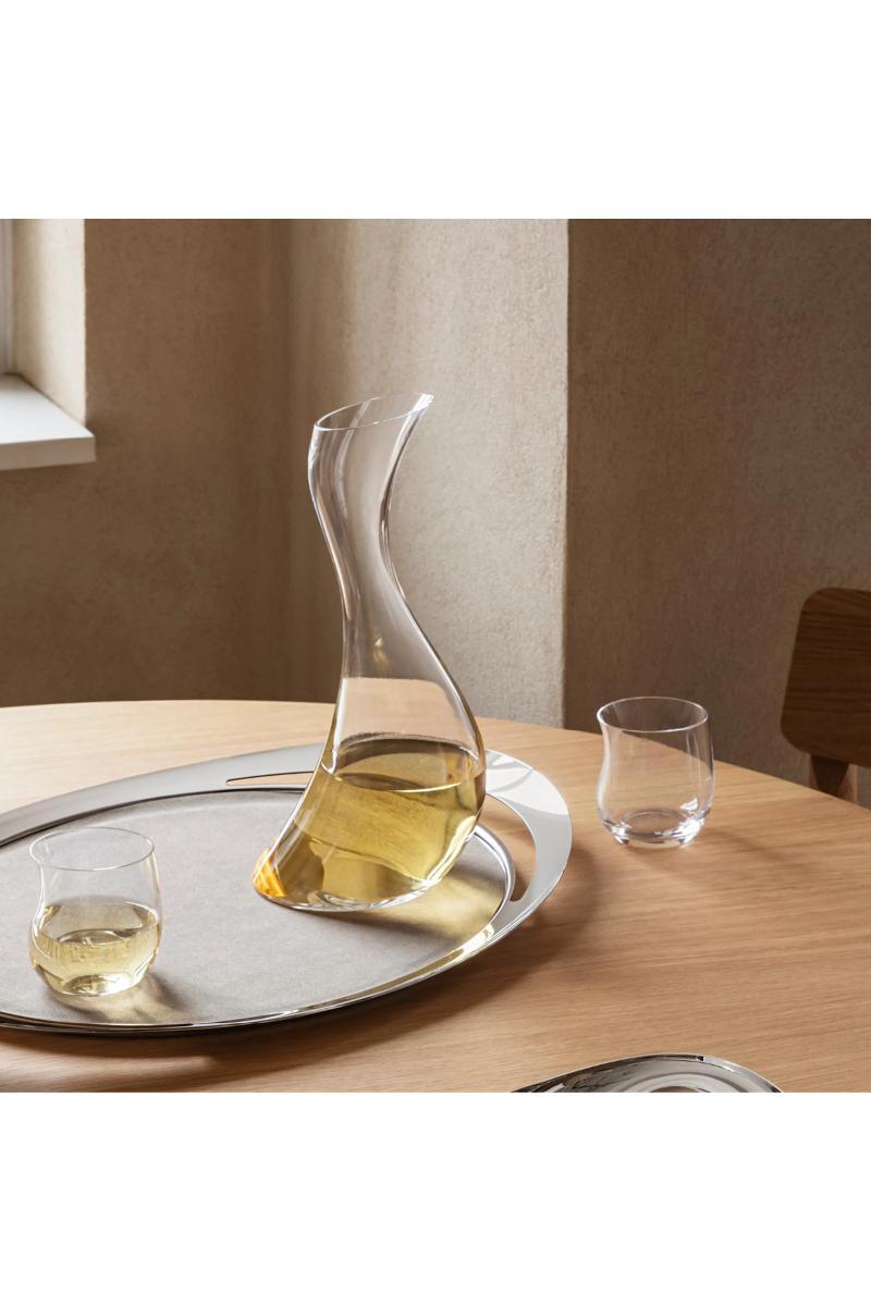 Det vil være vanskelig å finne en mer stilfull måte å servere frokost på sengen enn med dette elegante brettet i rustfritt stål. Den skulpturelle formen er foret med et subtilt grått semsket PU-skinn laget av kunstfiber, som står i kontrast til det skinnende metalliske ytre. Samtidig sørger en sklisikker overflate for å begrense søl når du serverer drikkevarer og beskytter samtidig brettet mot riper.