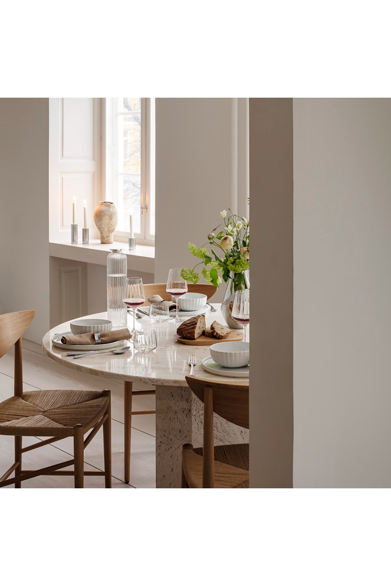 Iøynefallende og stilig - dette settet med seks blyfrie krystallglass bringer skandinavisk design til borddekkingen. De delikate rillene, inspirert av tidlig art deco-sølvtøy, gjør dem visuelt interessante samtidig som de gir et godt grep. Perfekte for et elegant middagsselskap med venner eller en avslappet frokost med familien.