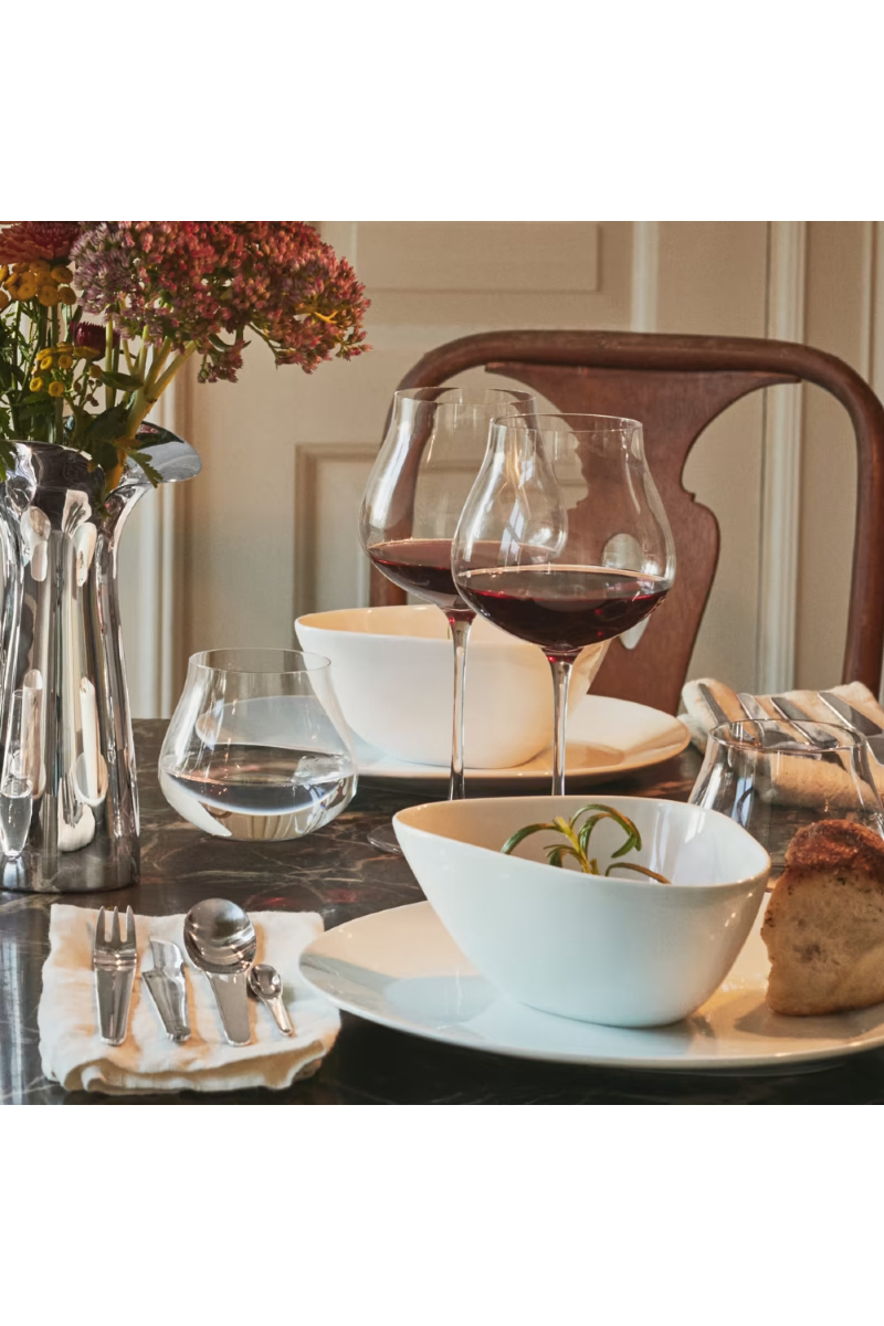 Dette settet med seks glass er et praktfullt eksempel på hvordan eleganse og funksjonalitet forenes i moderne skandinavisk design. Den organiske formen tilfører bordet et skulpturelt aspekt og føles behagelig i hånden, mens den tunge bunnen gjør glasset stabilt. Glassene passer like godt til fruktjuice om morgenen som til vann eller en dråpe whisky om kvelden, og fungerer perfekt sammen med det matchende Sky-barutstyret.