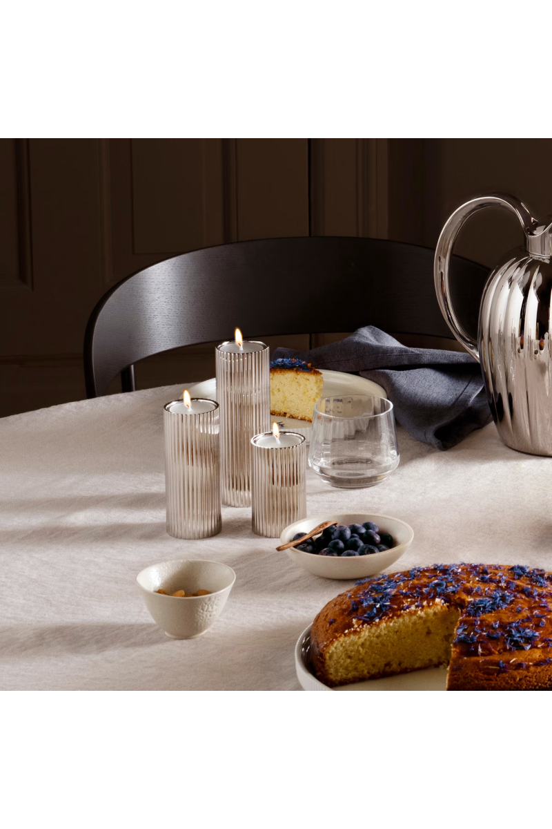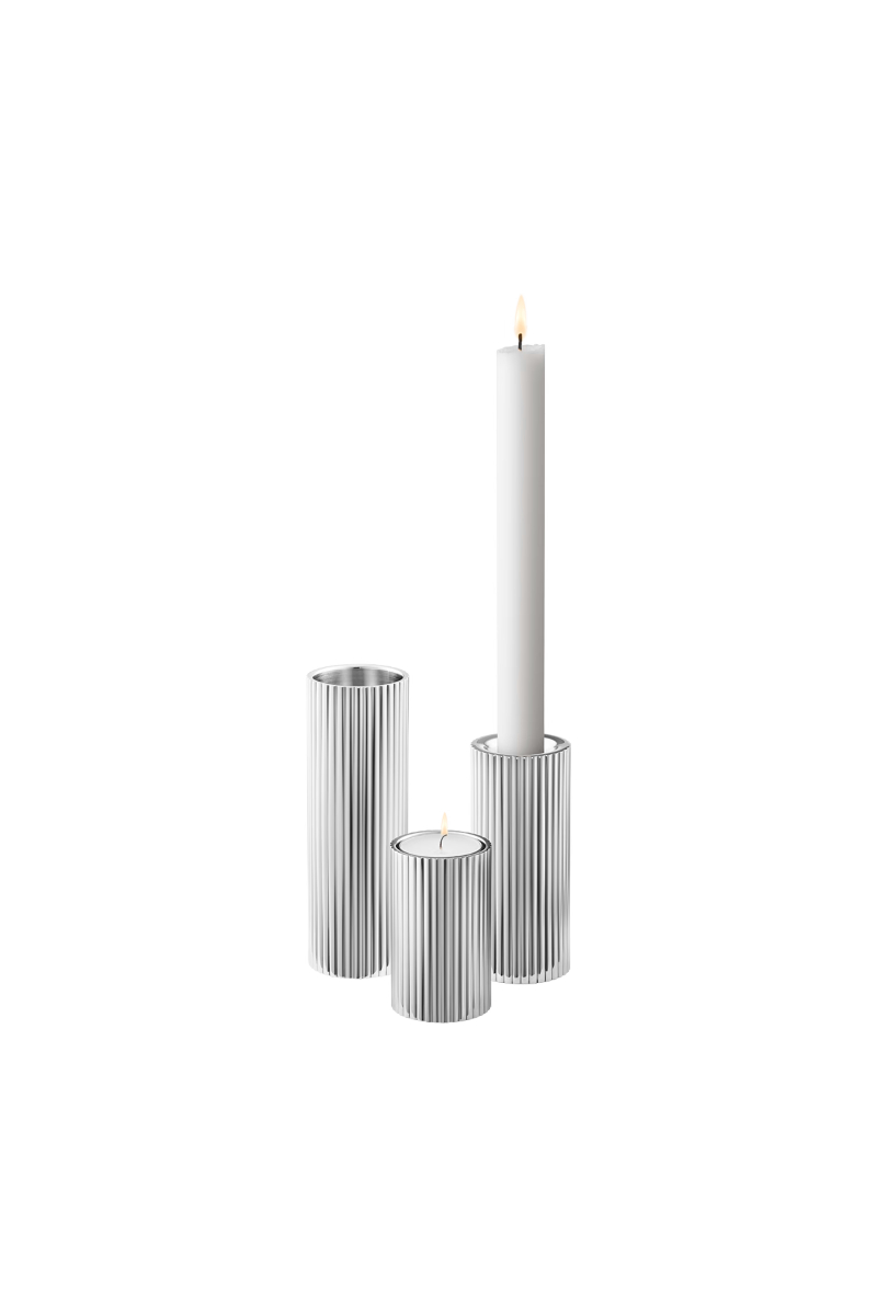 Gi ditt hjem et snev av autentisk skandinavisk modernisme med denne samlingen av tre lysestaker i rustfritt stål. Disse lysestakene er like allsidige og funksjonelle som de er vakre, og kan brukes med antikklys på den ene siden og telys på den andre. De kan enkelt plasseres individuelt rundt i rommet eller grupperes på spisebordet, vinduskarmen eller peishyllen for å skape en avslappende atmosfære. Dette designet er inspirert av Sigvard Bernadotte.