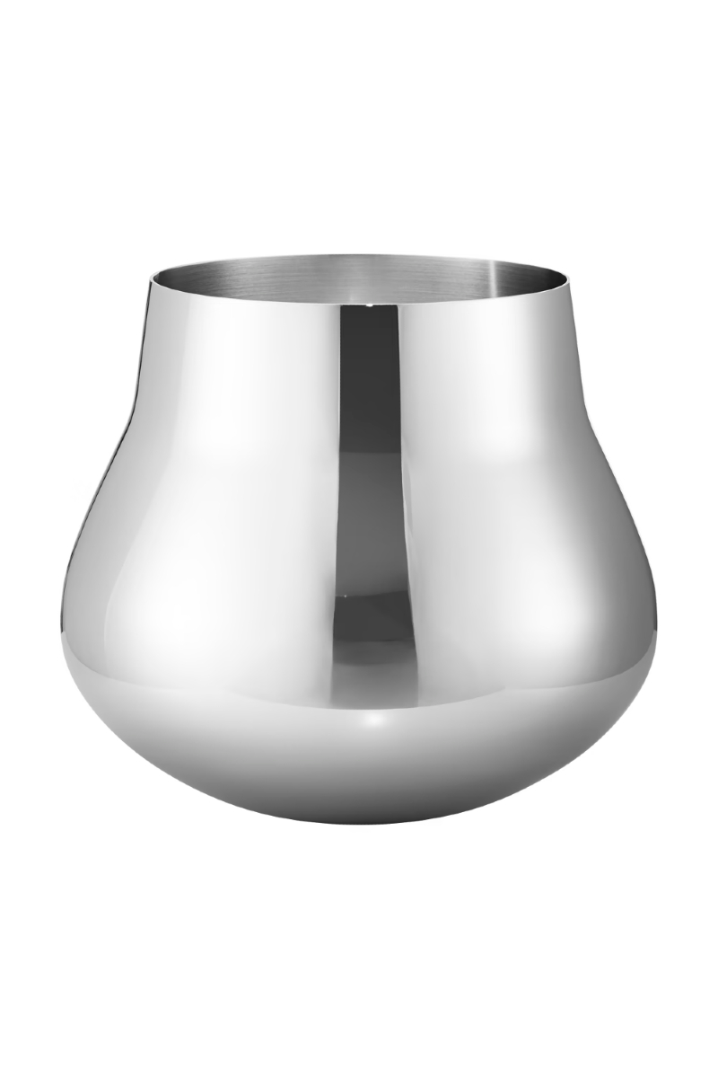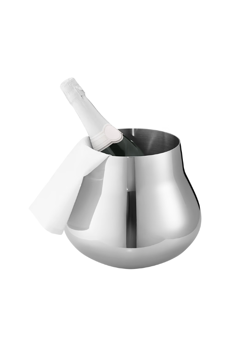 Med sin organiske, skulpturelle form er denne minimalistiske vin- og sjampanjekjøleren i rustfritt stål den perfekte måten å holde vin eller champagne på riktig temperatur. Den er stor nok til å romme to flasker vin eller en flaske champagne, og leveres med en hvit serviett som hjelper deg å servere dryppfritt, med stil!