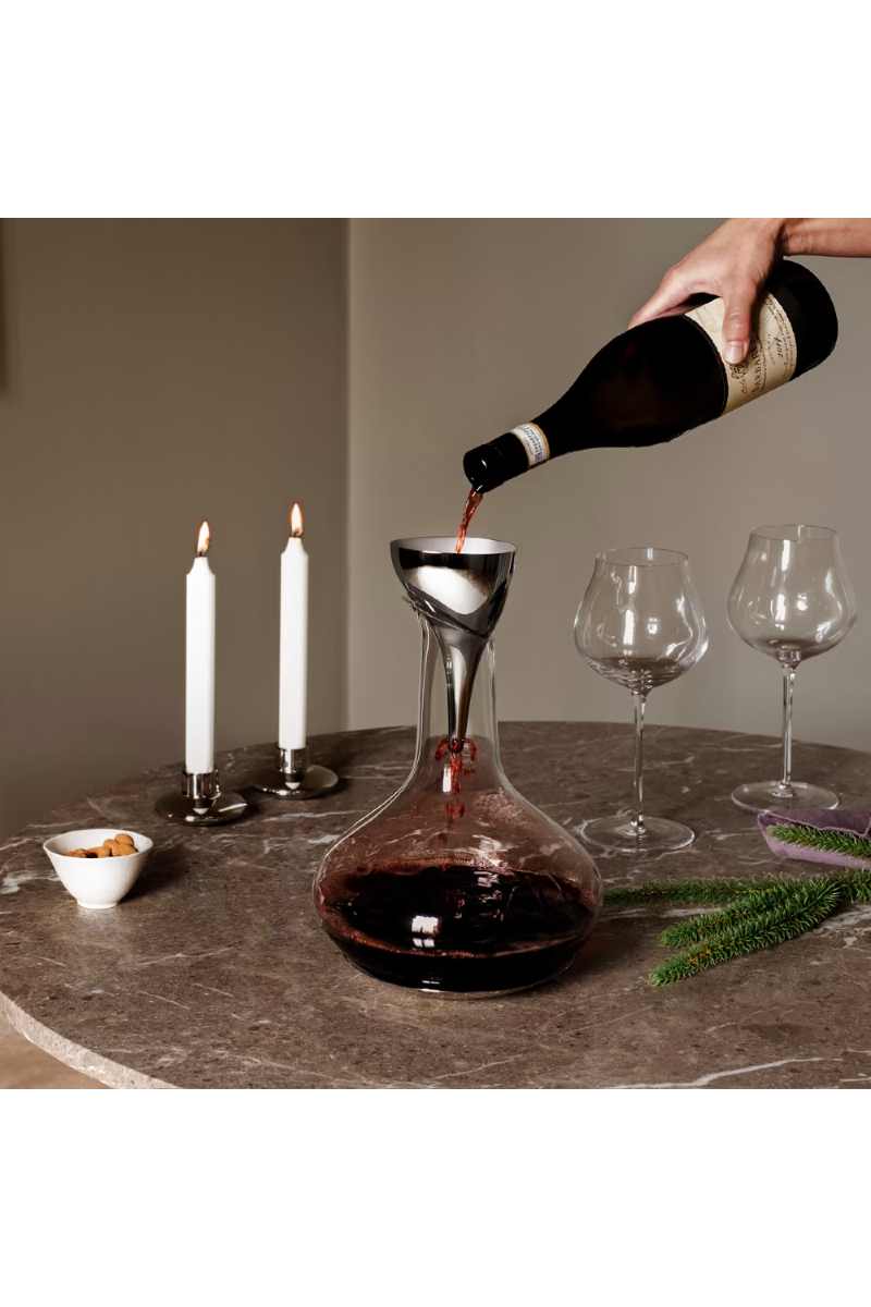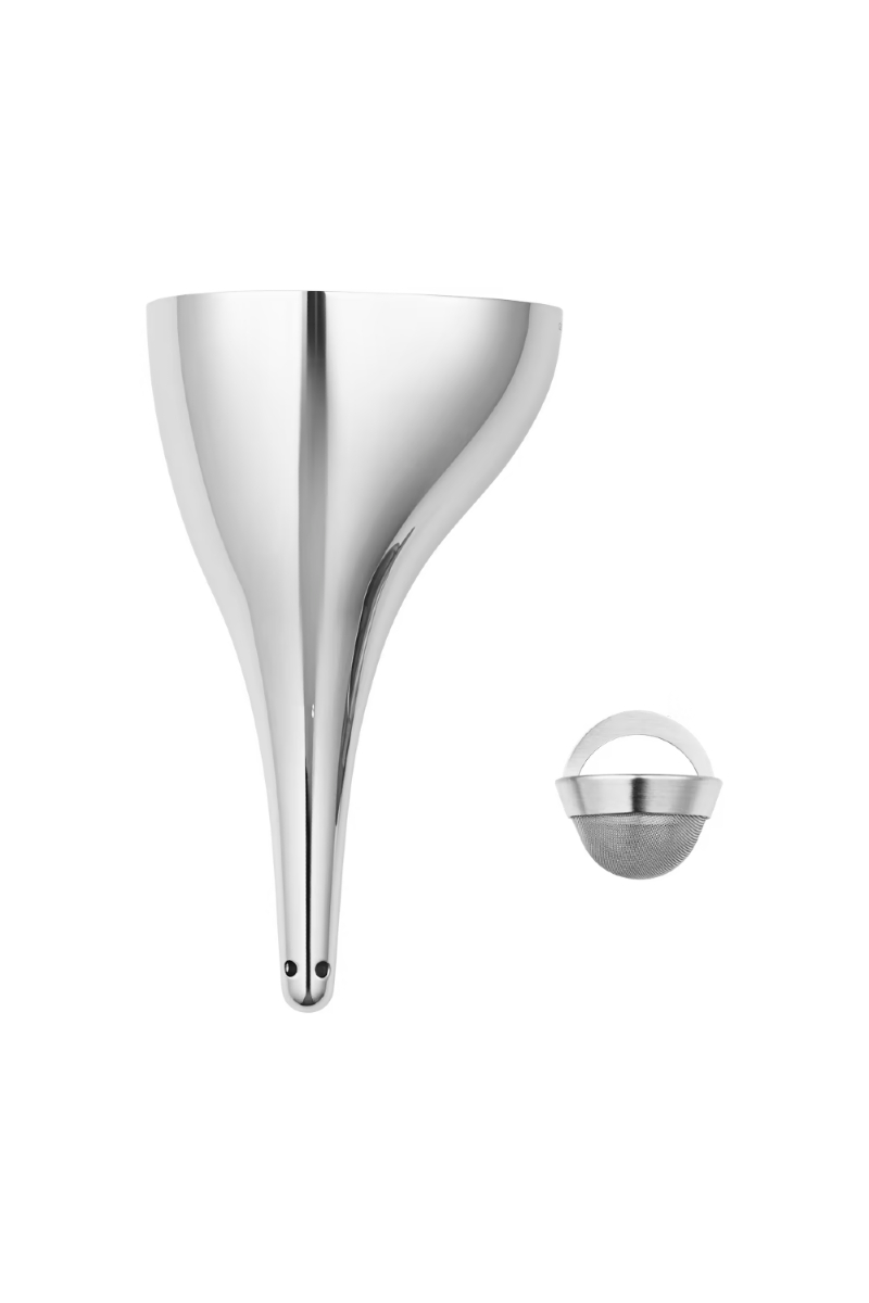 Å ha et øye for små detaljer er et kjennetegn på en god vert, og bruk av en dekanter kan bidra til både presentasjonen og smaken. Bruk denne stilfulle, asymmetriske vintuten til å overføre vinen fra flaske til karaffel og gi en følelse av luksus til ritualet. Den er laget av rustfritt stål og leveres med et avtakbart filter som fjerner bunnfall, og den passer perfekt sammen med Sky-dekanteren.