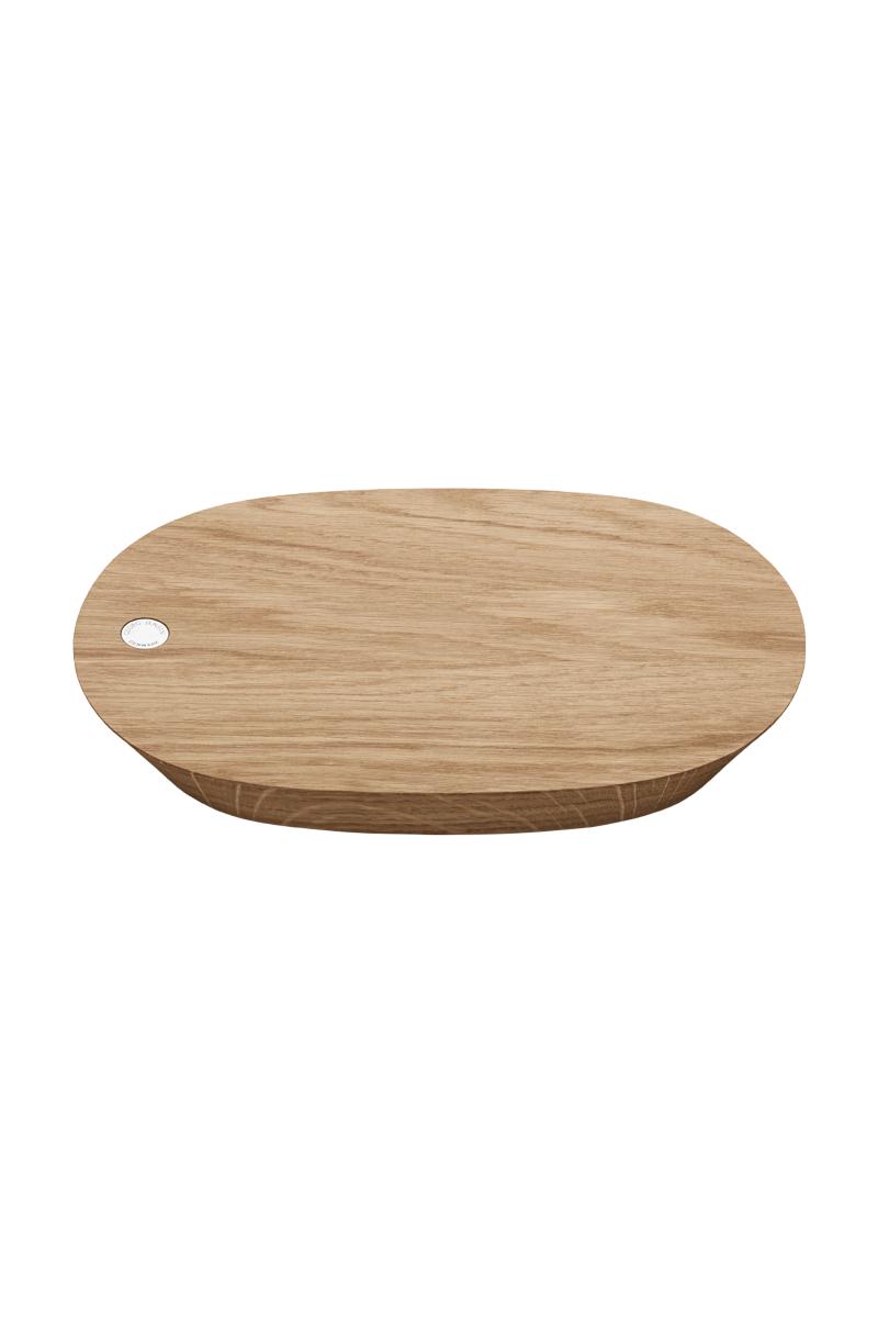 Det store serverings- og skjærebrettet i massiv eik er en ny design fra Alfredo-kolleksjonen som garantert løfter stilen i ethvert kjøkken. Brettets ovale form og skrå kanter gir det et elegant og unikt uttrykk - og en design som er praktisk og enkel å håndtere. Som en vakker detalj har brettet en liten plate i rustfritt stål med Georg Jensens logo.