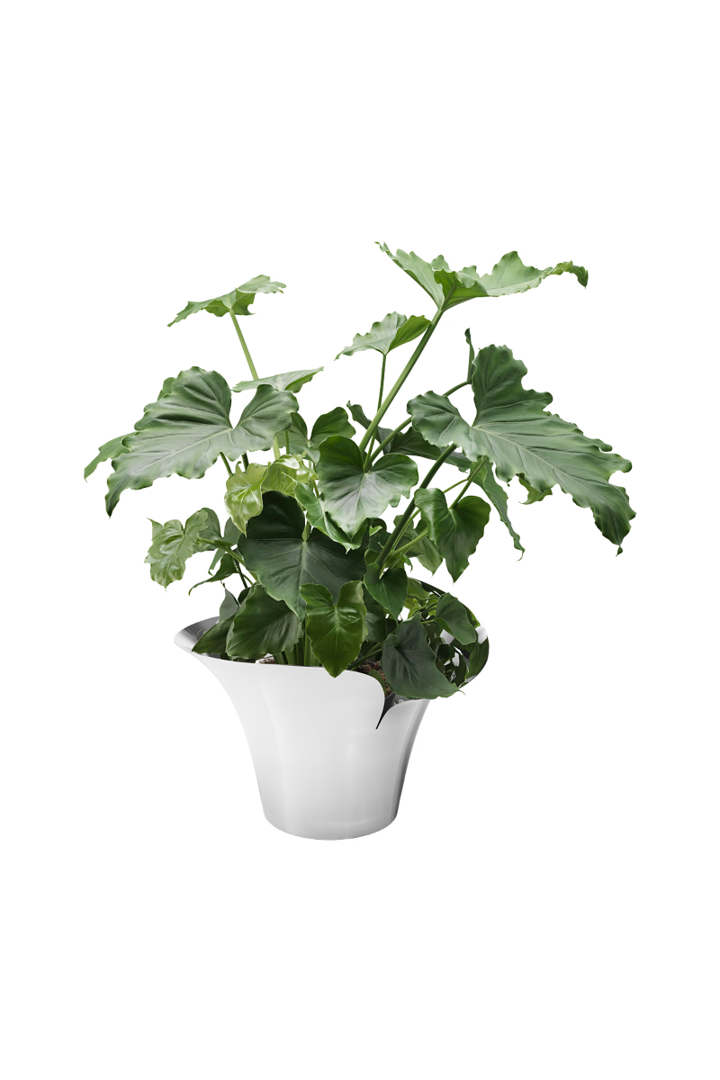 Helle Damkjærs vakre blomsterpotte i rustfritt stål, Bloom Botanica, kjennetegnes av organiske og kronbladlignende former som utgjør en elegant kontrast til plantene den omfavner. Denne blomsterpotten er designet for større planter og tilfører en moderne atmosfære til kjøkkenet eller stuen. På grunn av sin størrelse kan den også plasseres direkte på gulvet, og gir deg frihet til å skape en imponerende visuell effekt med din favorittplante. Bloom Botanica er et kunstnerisk uttrykk som bringer naturens skjønnhet inn i ditt hjem med stil.
