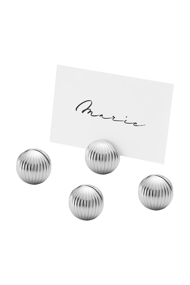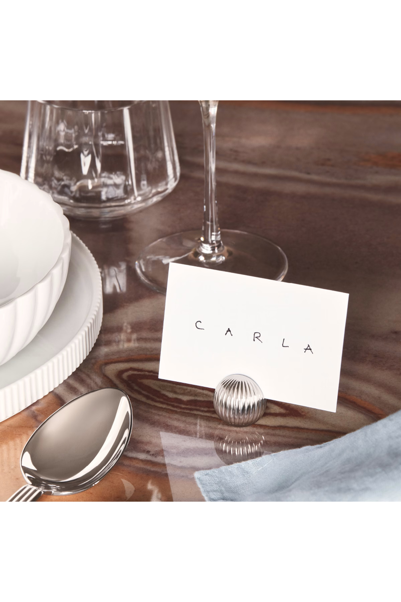 Disse elegante og diskrete bordkortholderne fra Bernadotte-kolleksjonen, inspirert av art deco-stilen, gir et sofistikert preg til enhver borddekking. Settet består av fire holdere og leveres i en stilfull gaveeske sammen med 20 papirkort. De er ikke bare en gjennomtenkt gave til verten, men kan også brukes til å vise frem menyer eller andre små skilt på en elegant måte.