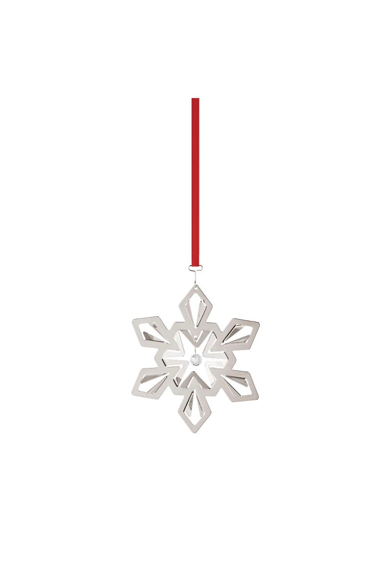 Det elegante snøfnugget fra 2024 Julekolleksjonen er designet av Georg Jensens mangeårige samarbeidspartner Sanne Lund Traberg. Ornamentet er inspirert av snøen som faller mykt fra vinterhimmelen. Det fine snøfnugget er belagt med palladium og henger i et fint, rødt bånd, og midt i ornamentet glitrer en vakker, liten kule av zirkon.
