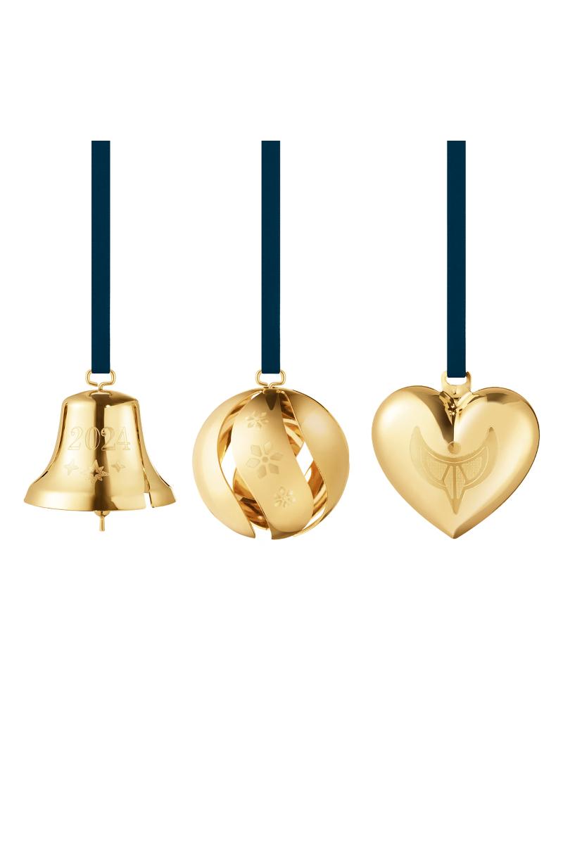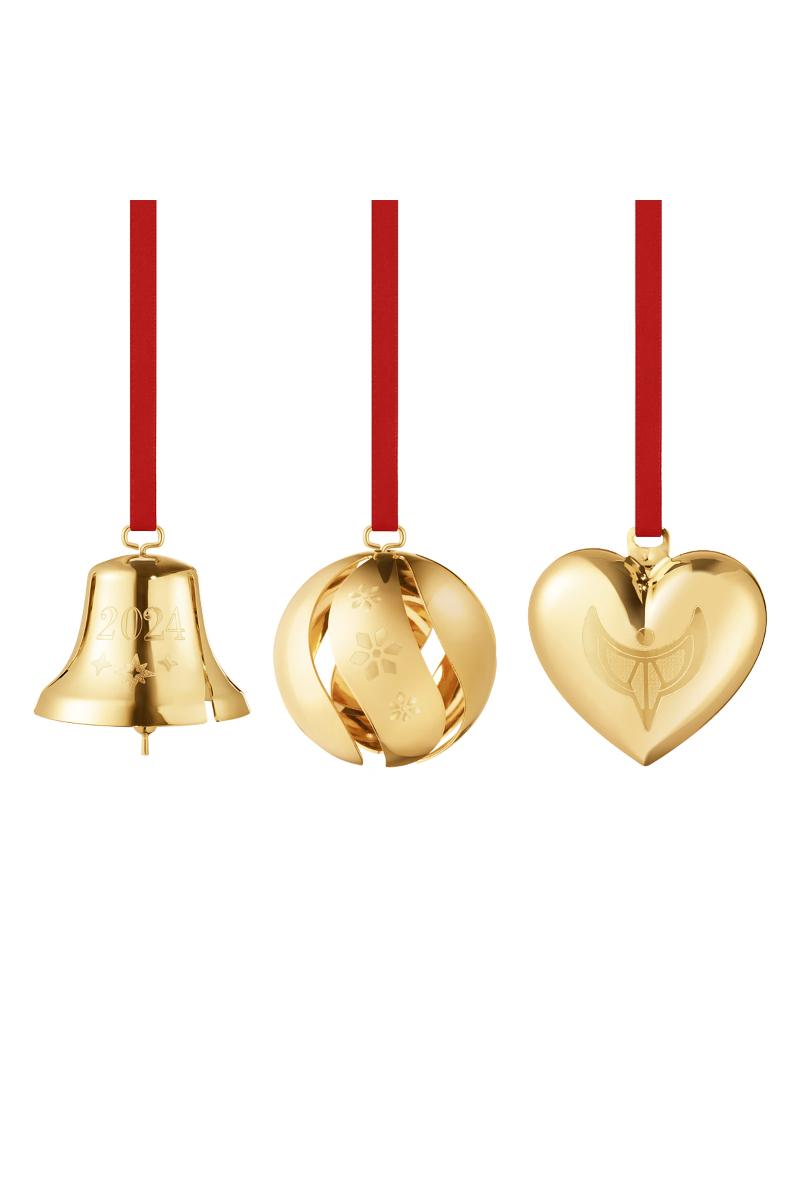Dette settet med tre funklende, gullbelagte ornamenter er fra 2024 Julekolleksjonen, som Sanne Lund Traberg har designet for Georg Jensen. Settet består av tre forskjellige ornamenter. Heng dem på juletreet i de elegante, røde båndene og skap en hyggelig julestemning med et hint av nostalgi.