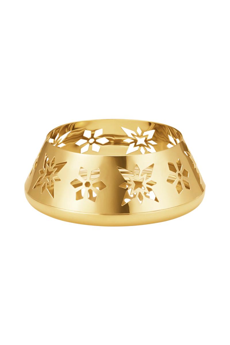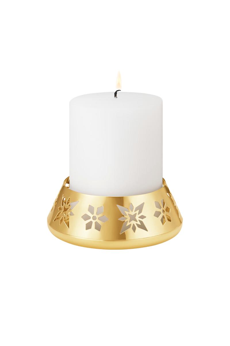 Denne elegante, gullbelagte kubbelysestaken har vakre, utskårne motiver og er designet for å reflektere flammens varme skjær. Lysestaken er designet av Georg Jensens mangeårige samarbeidspartner Sanne Lund Traberg som en del av 2024 Julekolleksjonen.