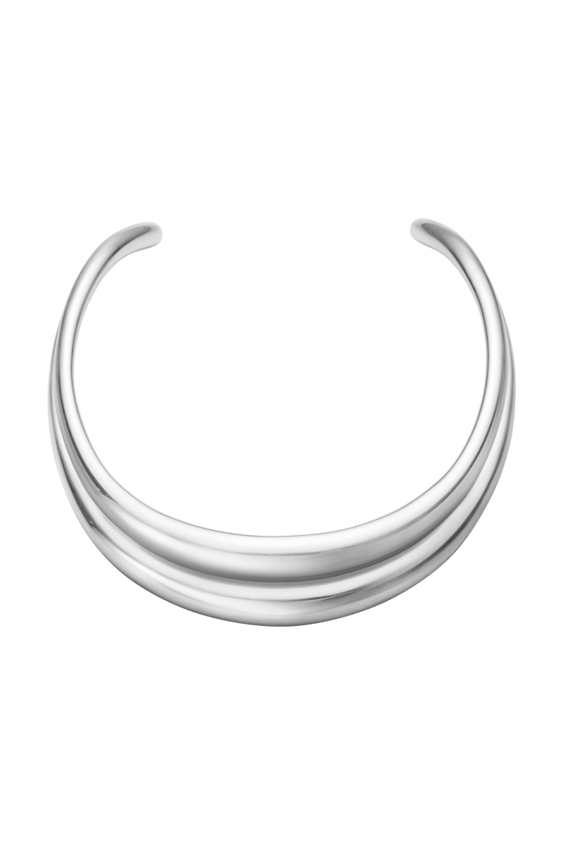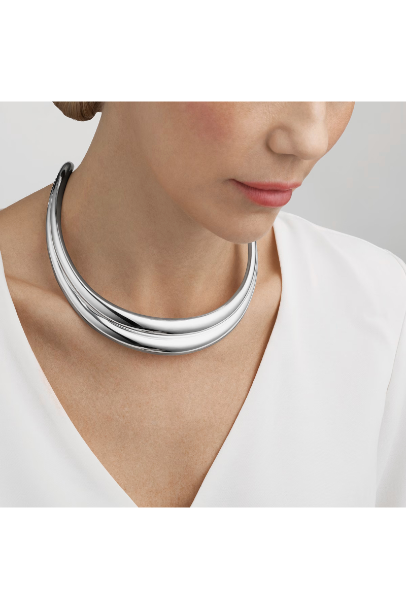 Denne flotte halsringen er dristig og skulpturell, og fanger skjønnheten i to perfekte kurver som møtes i en tydelig definert linje. Halsringen føyer seg inn i Georg Jensens tradisjon for organiske sølvsmykker, og den naturlige formen gir en passform som enkel og behagelig å ha på. Den har en kraftig appell som tilfører alle antrekk en følelse av drama og er det perfekte smykket for en sterk kvinne som definerer sin egen stil.