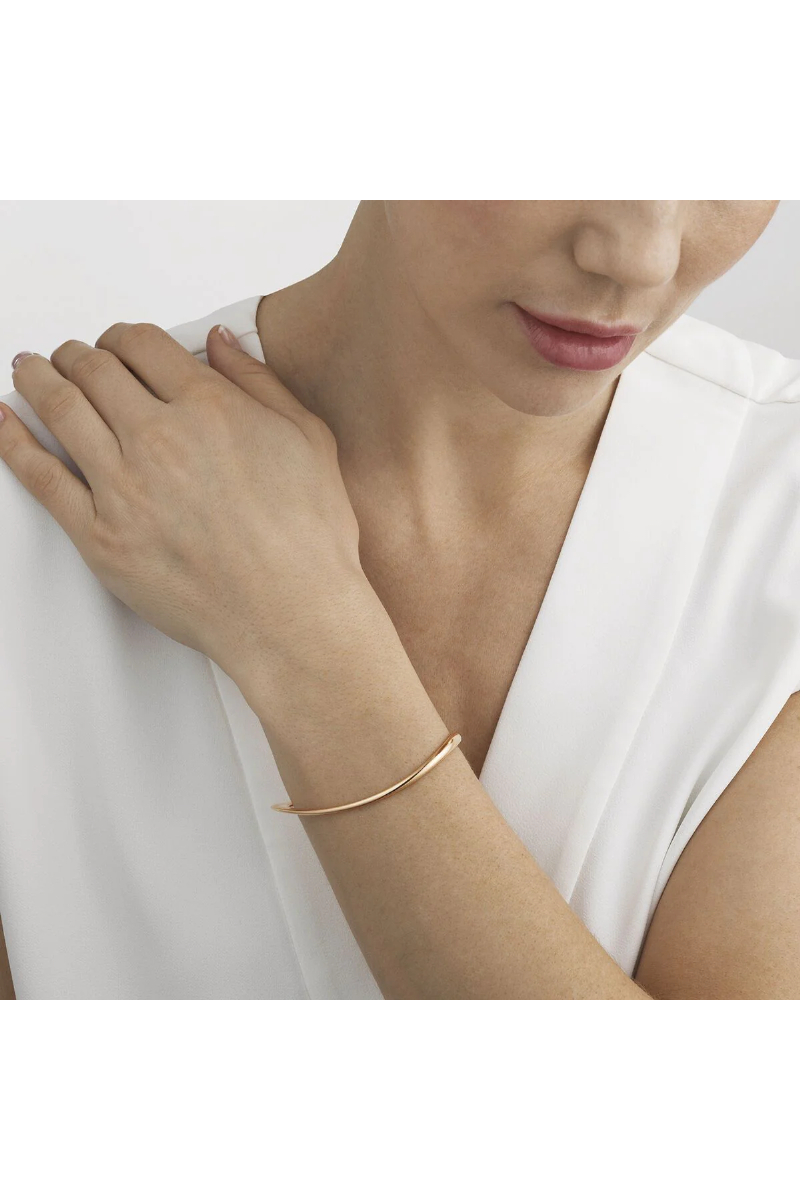Dette elegante armbåndet i 18 kt. gull har en vakker naturlig flyt som omfavner håndleddet, og skaper et skulpturelt smykke som balanserer mellom det subtile og det storslagne. Det kan bæres alene for å uttrykke en tidløs enkelhet, eller kombineres med andre armbånd for å skape en personlig stil.