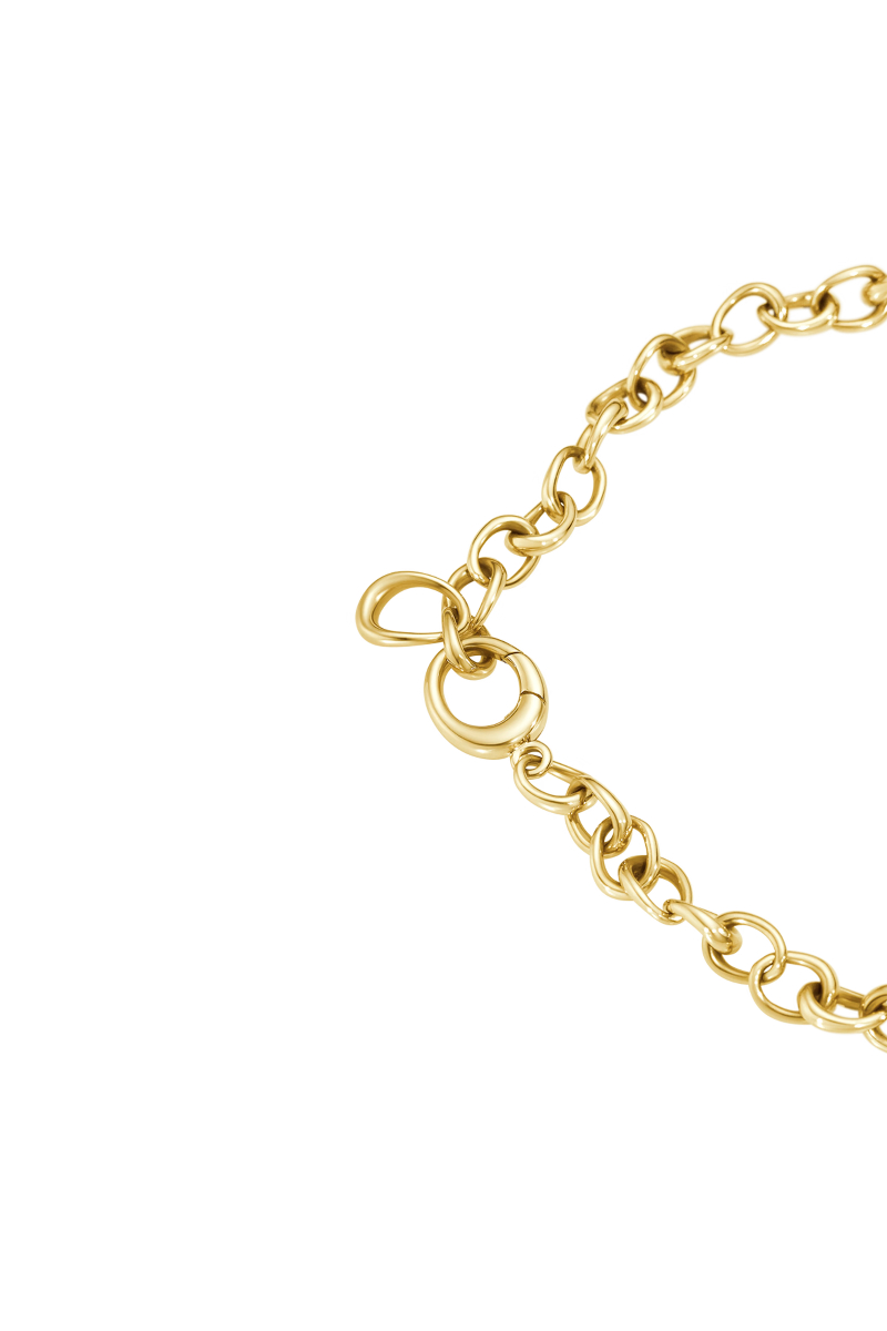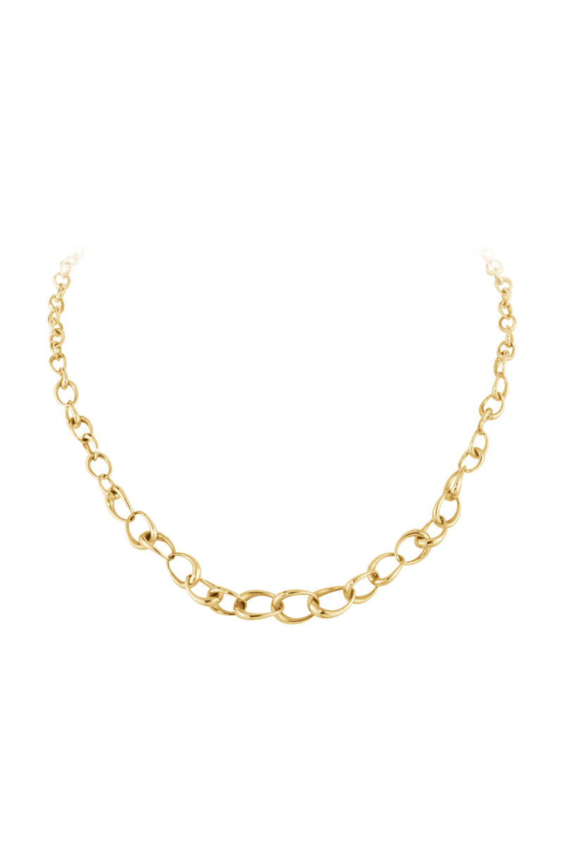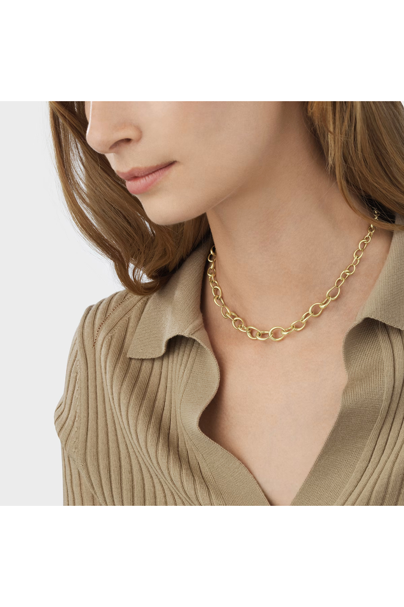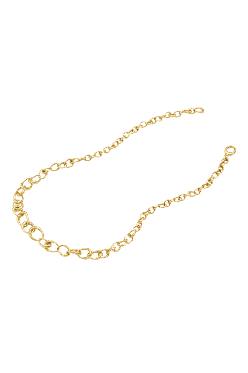 Offspring halskjede i gull er skapt av Jacqueline Rabun og består av en serie sammenflettede ovale ledd i ulike størrelser, som leker med perspektiver. Smykket er laget av 18 kt. gull og inkluderer et hengende ledd bak som fungerer som et lite anheng.