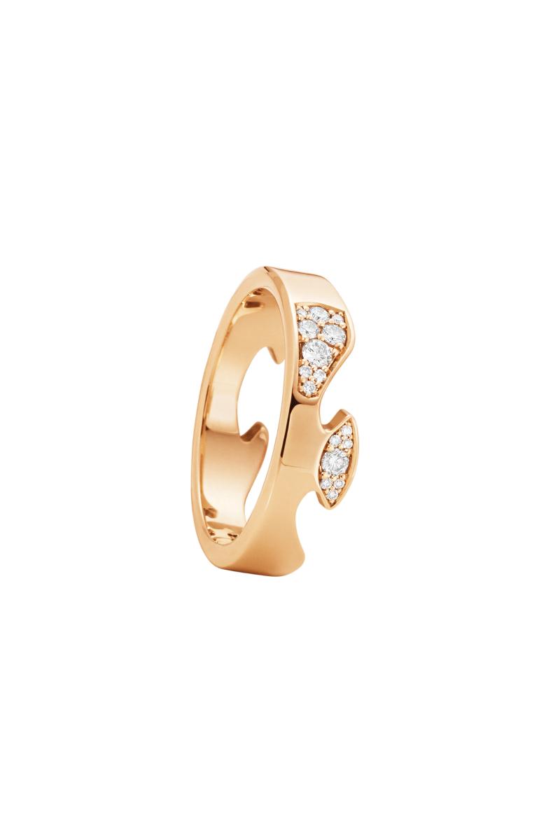De myke og organiske linjene i den tidløse Fusion-ringen blir vakkert fremhevet av innslagene av pavéinnfattede briljantslipte diamanter som gir assosiasjoner til lette skyer mot den glatte bakgrunnen på denne enderingen i 18 karat roségull. Du kan harmonisk kombinere den med andre Fusion midt- og avslutningsringer for å skape et smykke som best gjenspeiler din unike personlighet. Vær oppmerksom på at mønsteret med skyer varierer mellom de to Fusion enderingene (AA og AB). Derfor bør du forsikre deg om å inkludere én av hver (AA og AB) når du setter sammen Fusion-endene, for å sikre at diamantene har samme orientering når de bæres sammen.