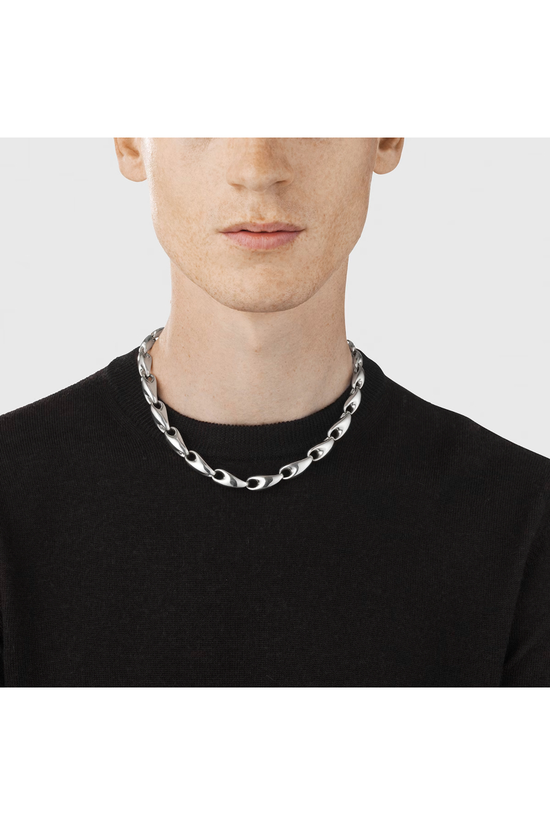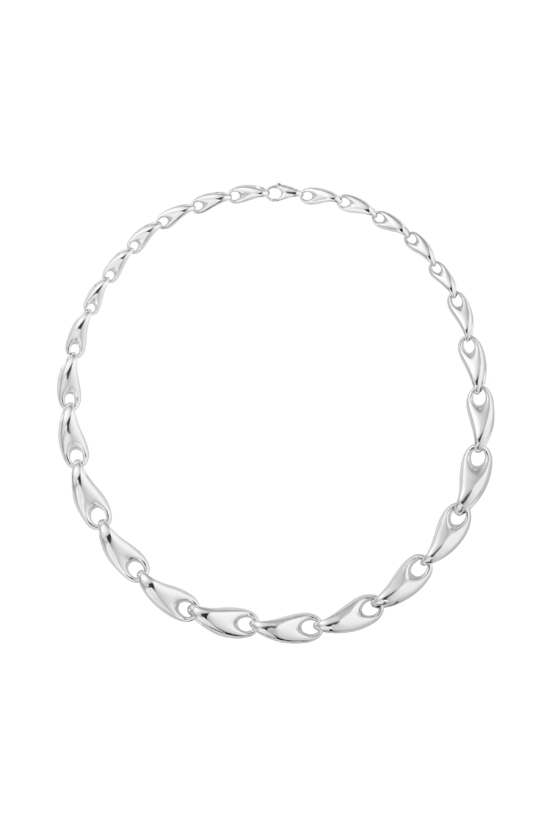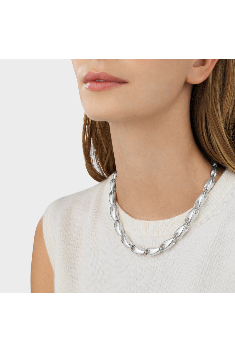 En serie sammenflettede lenker i sterlingsølv, som gradvis øker i størrelse fra baksiden til forsiden, er knyttet sammen for å skape en ny tolkning av det klassiske lenkehalskjedet. Dette iøynefallende statement-smykket, designet av Jacqueline Rabun, kombinerer en tøff stil med Georg Jensens skulpturelle designspråk. Det lukkes elegant med en integrert klemme.