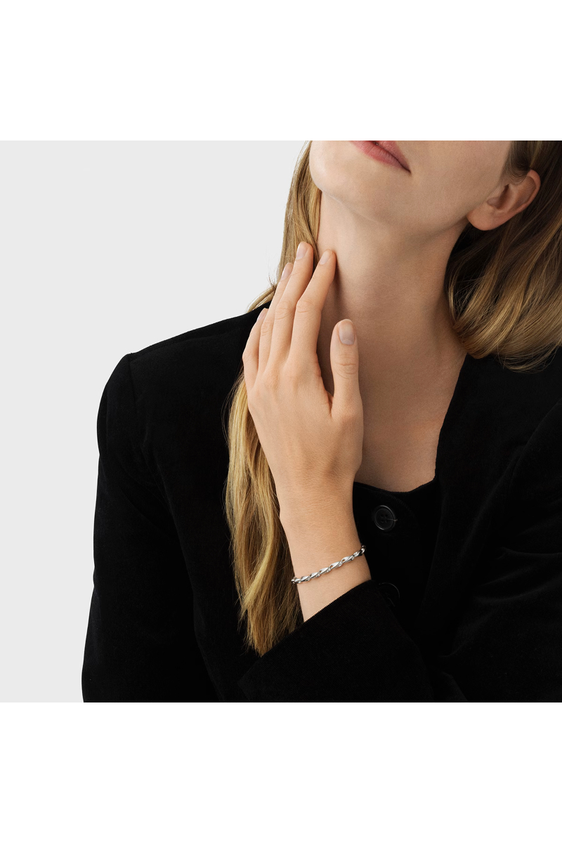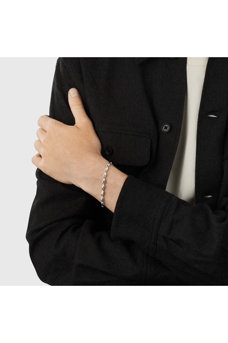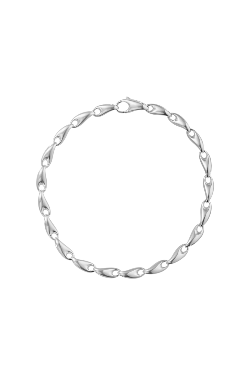 Dette moderne lenkearmbåndet er en ny tolkning av det klassiske designet, sammensatt av organiske lenker i sterlingsølv. Smykket, skapt av Jacqueline Rabun, balanserer en robust stil med Georg Jensens karakteristiske skulpturelle formspråk. Armbåndet lukkes elegant med en integrert klemme.