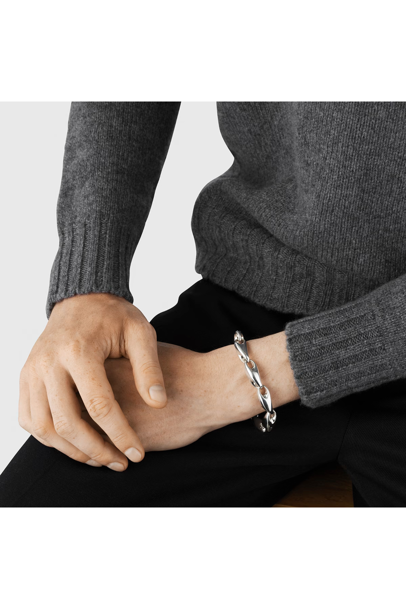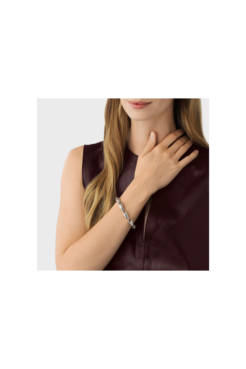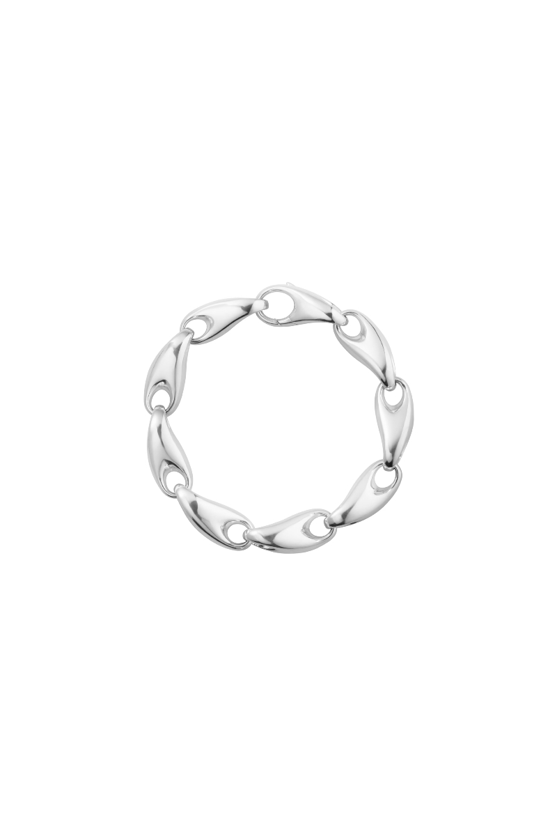 Dette tradisjonelle lenkearmbåndet tar en ny retning med dette skulpturelle designet av Jacqueline Rabun. Smykket består av en rekke sammenflettede lenker i organisk form i sterlingsølv, og det fusjonerer en tøff stil med Georg Jensens organiske former. Armbåndet lukkes med en integrert klemme.
