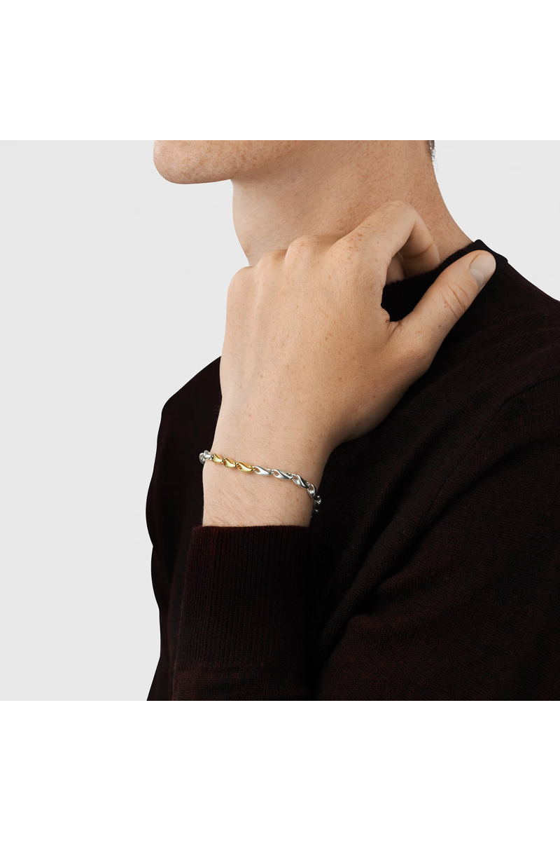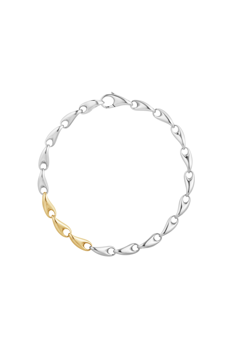 Dette armbåndet har en elegant detalj med tre ledd i 18 kt. gull omgitt av sterlingsølv-lenker. Designet av Jacqueline Rabun, kombinerer armbåndet en dristig og moderne stil med Georg Jensens karakteristiske skulpturelle formspråk. Det lukkes enkelt med den innebygde låsen.