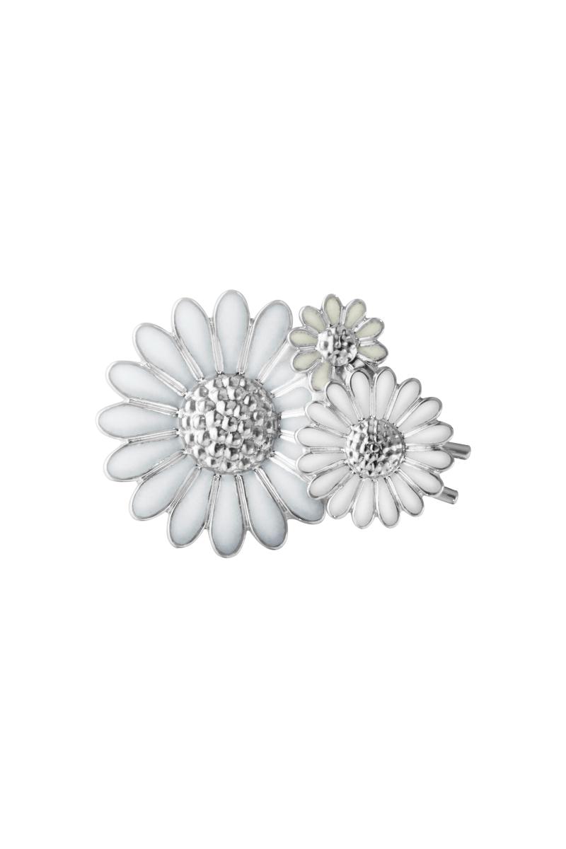 Tre prestekrager i ulike størrelser overlapper hverandre i denne hårspennen, som fortolker Georg Jensens ikoniske Daisy-design på en ny og forfriskende måte. Hårspennen er skapt i samarbeid med motedesigner Stine Goya og laget i rhodiumbelagt sterlingsølv, som er håndmalt på en vakker måte i nyanser av hvit emalje.