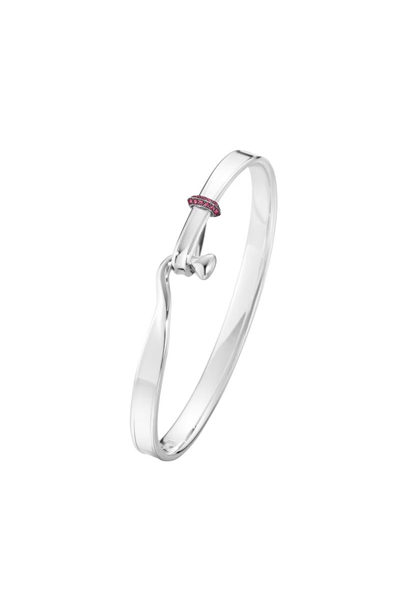 Dette armbåndet, designet av Vivianna Torun Bülow-Hübe i 1968, har en unik lås: En buet krok i den ene enden og en løkke i den andre som møtes i en naturlig bevegelse. Den gjenspeiler ikke bare designerens inspirasjon bak smykket – at to halvdeler er sterkere sammen – men også prinsippene i funksjonalismen, der hvert element tjener et formål. Torun var en banebrytende svensk sølvsmed, og den første kvinnen innen sitt felt som høstet internasjonal anerkjennelse. Hun ble en av Georg Jensens sentrale samarbeidspartnere og skapte noen av designhusets mest populære smykker – blant annet dette armbåndet. Et kjennetegn ved arbeidet hennes var å gjøre låsen til et viktig designelement, noe dette Torun-armbåndet er et vakkert eksempel på. Denne utgaven av armbåndet har et bånd av rosa safirer som en diskré og unik detalj. Ettersom smykket har naturlige steiner, må det forventes små variasjoner i fargen.