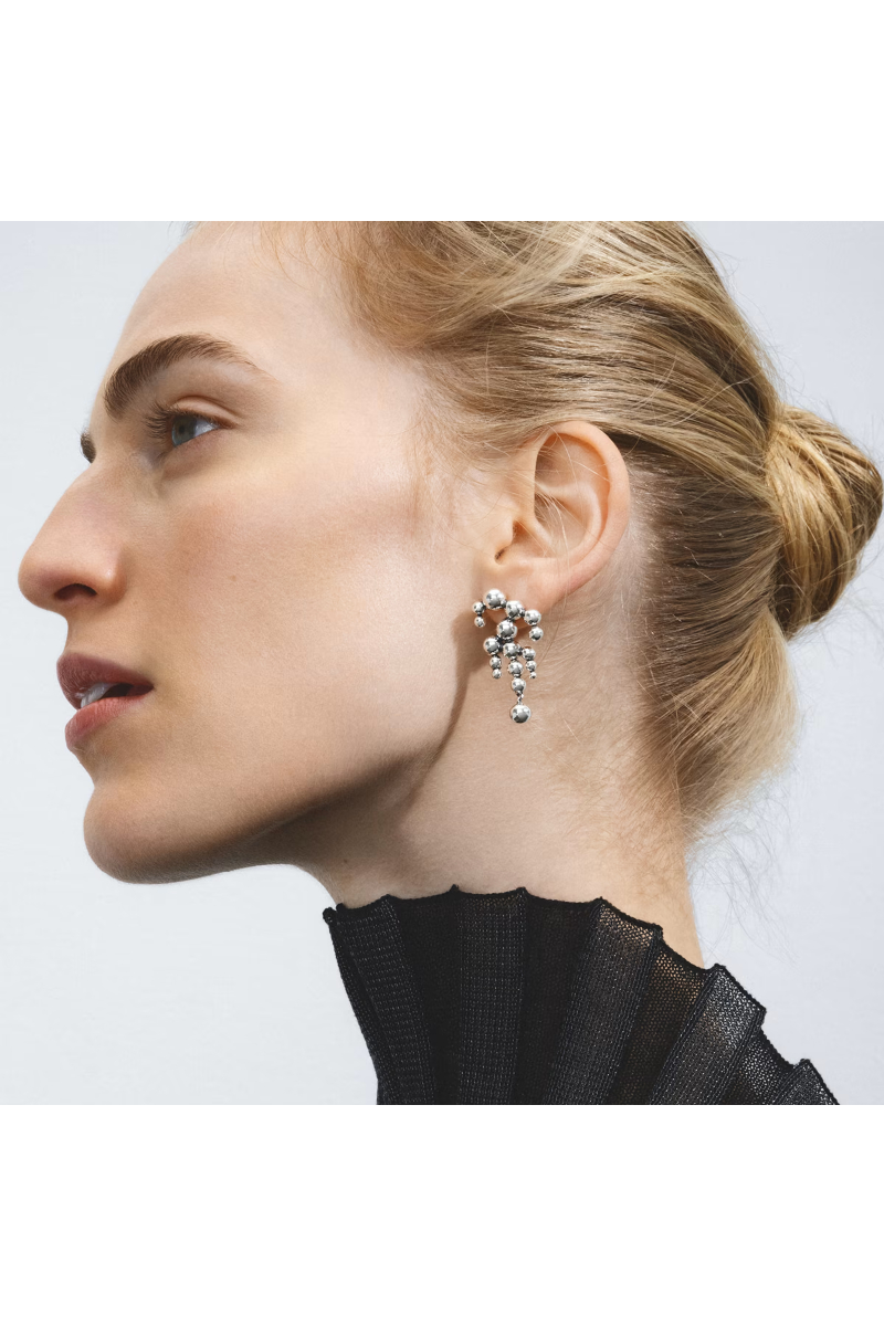 Sølvkulene i denne designen minner om Georg Jensens klassiske druemotiv, men øredobben har en tidløs eleganse og allsidighet. De vakre sølvkulene følger personens bevegelser og gir smykket en spesiell dynamikk. Øredobben selges som enkeltstående stykker.