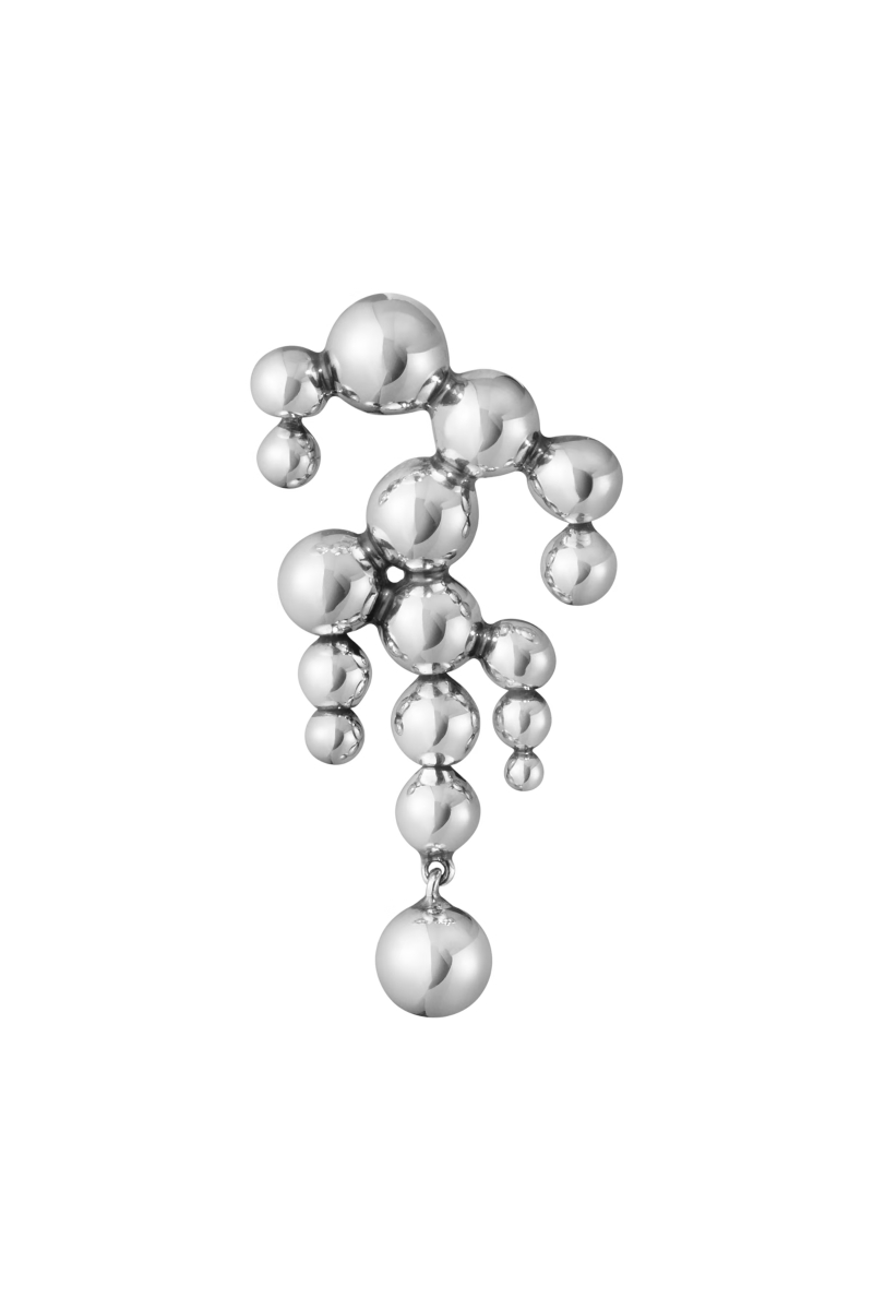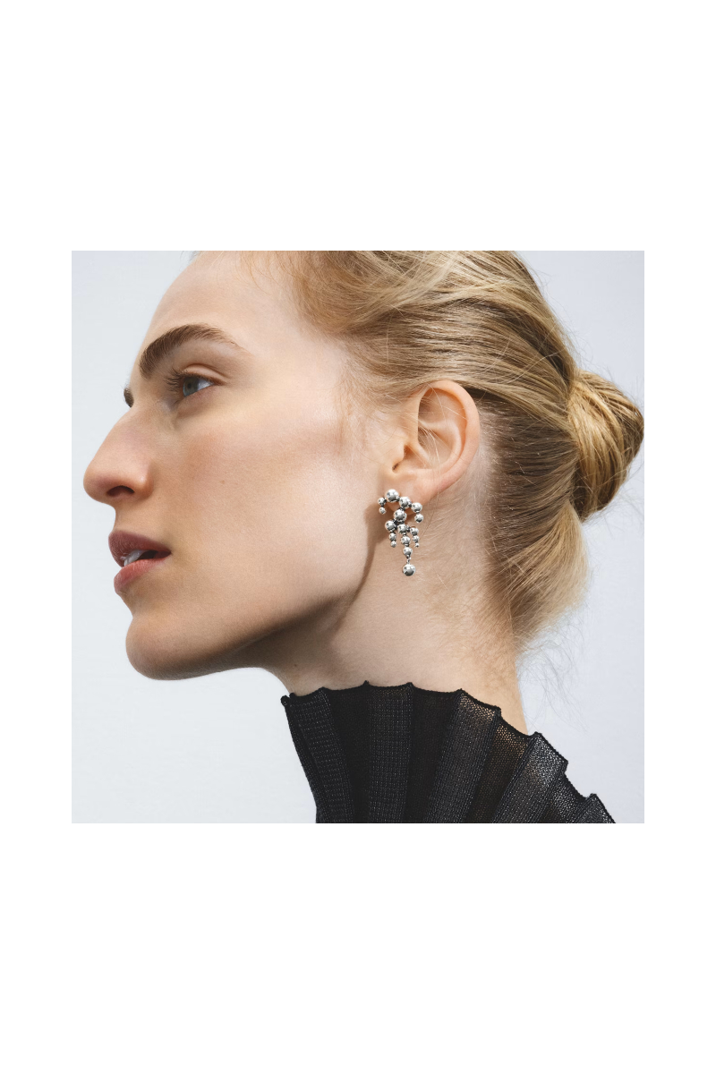 Sølvkulene i denne designen minner om Georg Jensens klassiske druvmotiv, men øredobben har en tidløs eleganse og allsidighet. De vakre sølvkulene følger personens bevegelser og gir smykket en spesiell dynamikk. Øredobben selges som enkeltstående stykker.