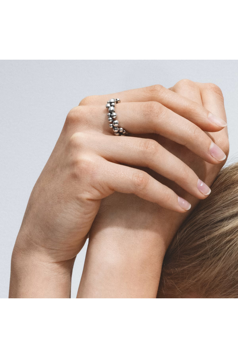 Denne ringen har en unik og enkel design med sølvkuler som minner om Georg Jensens klassiske druemotiv. Smykket er en moderne tolkning av de ikoniske druene og gir ethvert antrekk et dynamisk preg.