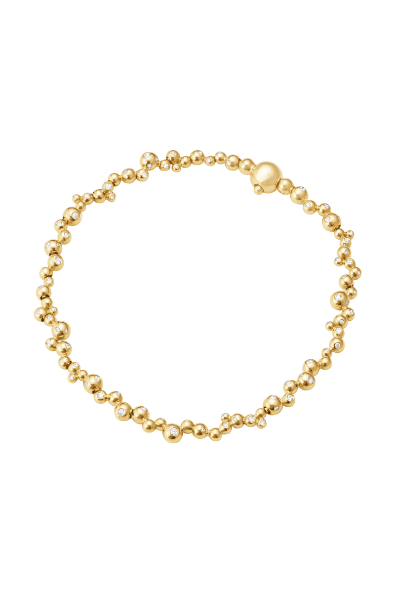 Dette halskjedet er Moonlight Grapes-versjonen av det klassiske tennishalskjedet, og kulene i 18 karat gull med diamanter er inspirert av Georg Jensens ikoniske druemotiv. Gullkulene blir gradvis større på smykkets front, og side ved side danner de et halskjede som legger seg elegant rundt halsen.