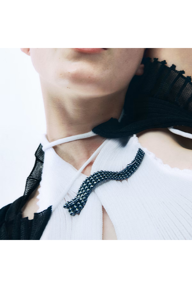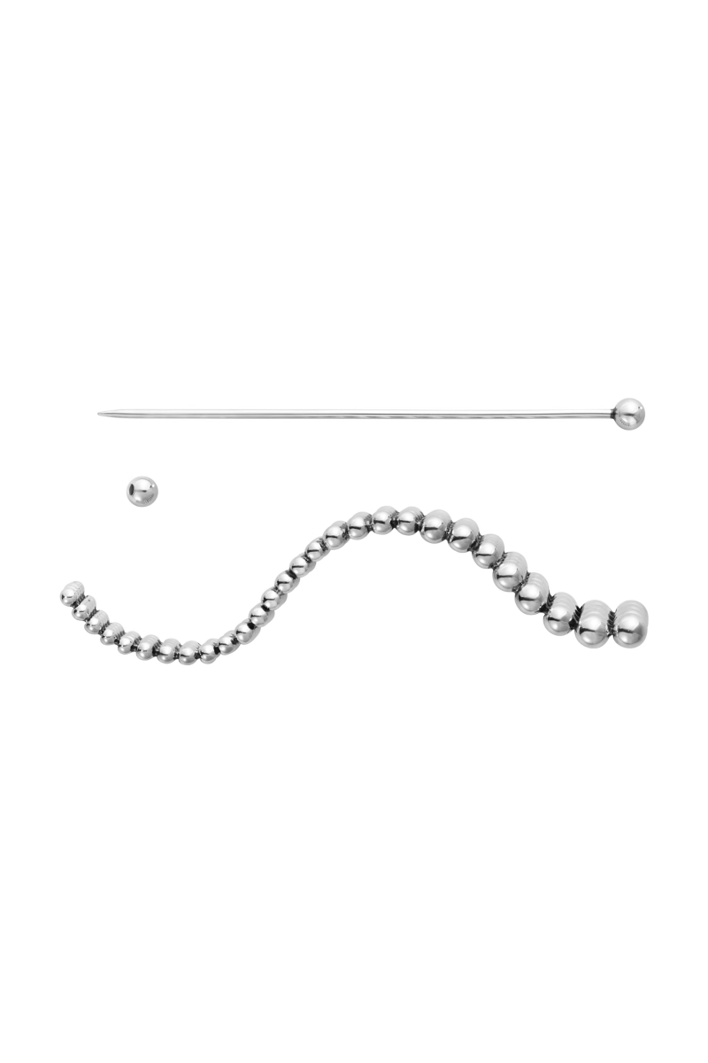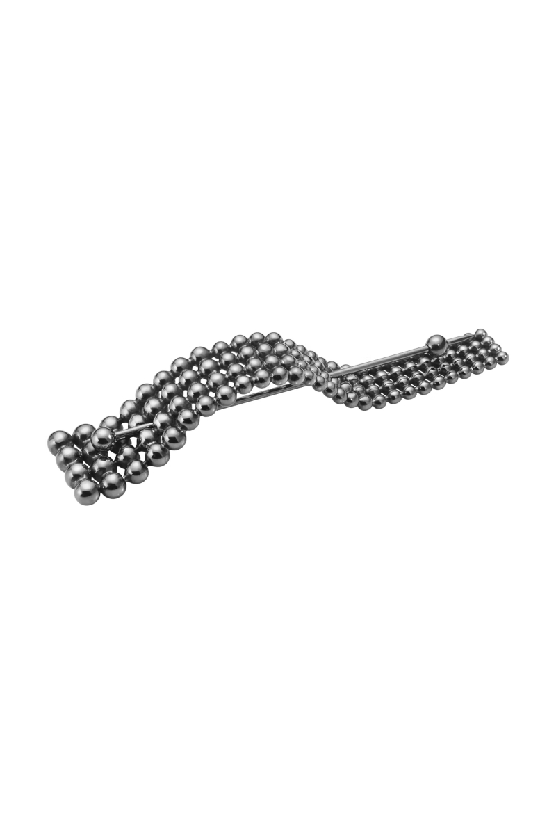 En vakker brosje med fire parallelle rader av kuler i resirkulert sterlingsølv, som gradvis øker i størrelse. Den ene siden av smykket har en lett bueform, og brosjen er oksidert for å fremheve den elegante grå nyansen. Brosjen er laget av resirkulert sterlingsølv og er en del av samarbeidet mellom Georg Jensen og det danske designmerket A. Roege Hove. Kolleksjonen har sitt opphav i møtet mellom disse to håndverkene: Georg Jensens ekspertise innen sølvarbeid og A. Roege Hoves innovative tilnærming til strikkemote. Smykket har en innebygd nål som kan brukes til å feste brosjen på alle typer klær.