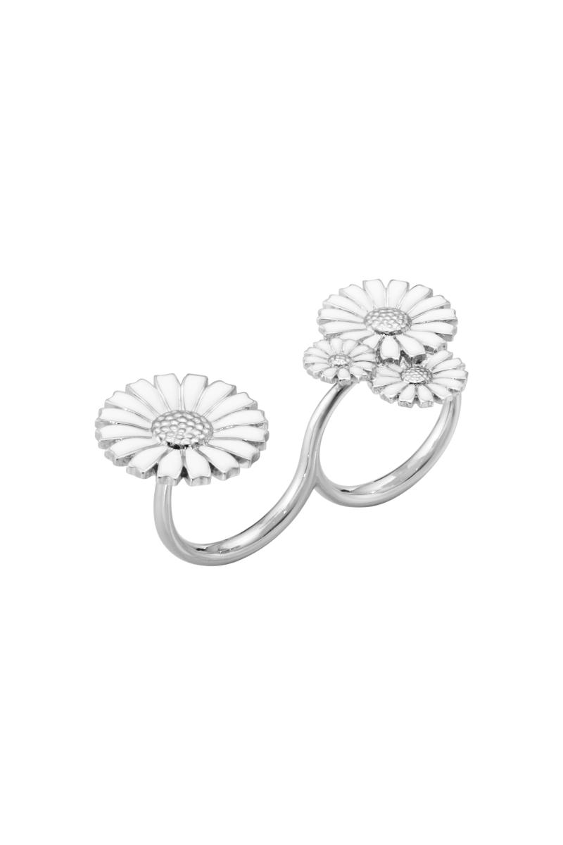 Fire tusenfryd i forskjellige størrelser pryder denne dristige, men sofistikerte doble ringen i sterlingsølv. Ringen er håndmalt med hvit emalje og designet for å elegant pakke rundt to fingre komfortabelt.