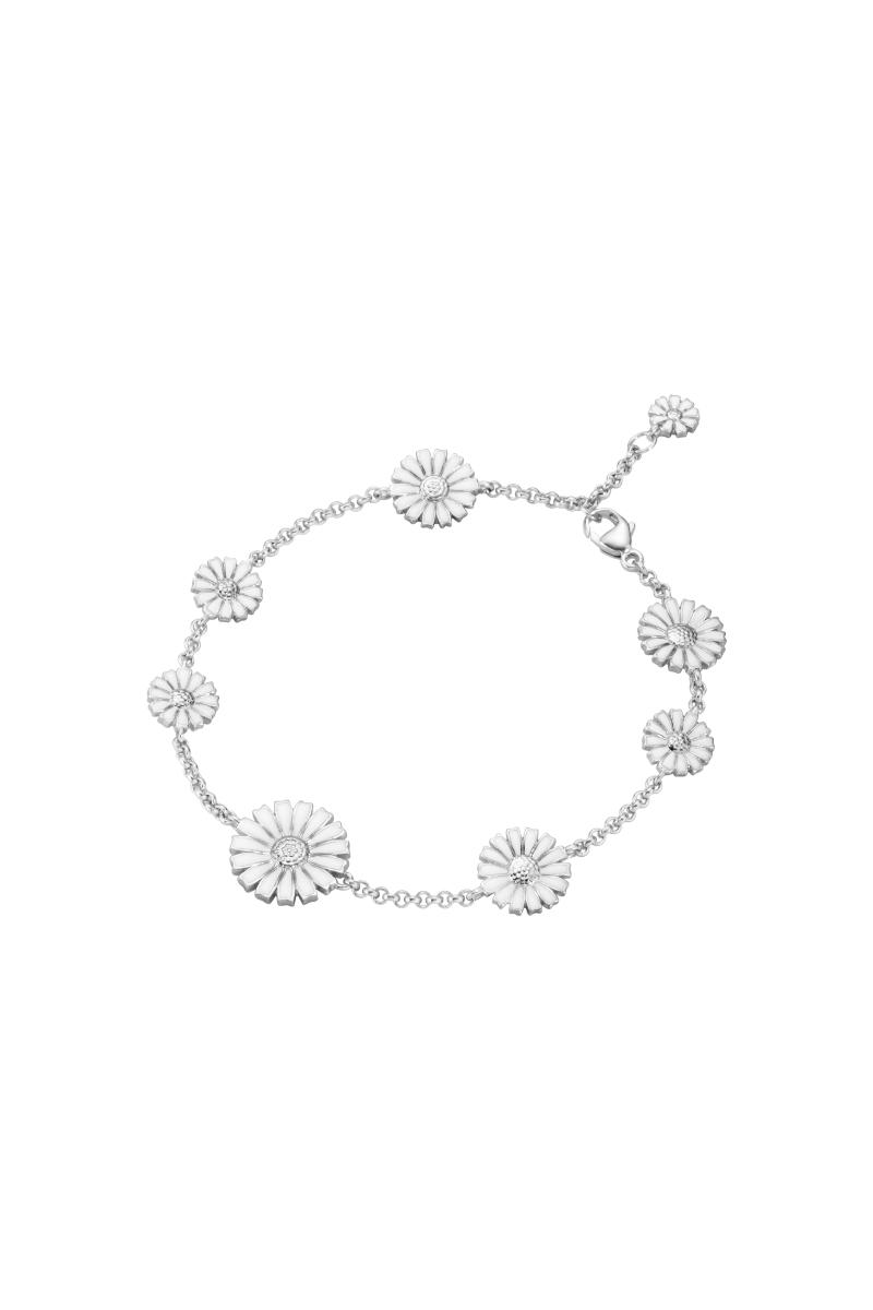 En serie blomstrende hvite tusenfryd på en kjede i sterling sølv gir liv til dette elegante og allsidige armbåndet. Verket er en del av Georg Jensens ikoniske Daisy-kolleksjon, som opprinnelig ble inspirert av en tusenfrydformet brosje fra 1940-tallet som ble gitt i gave til H.M. Dronning Margrethe II.