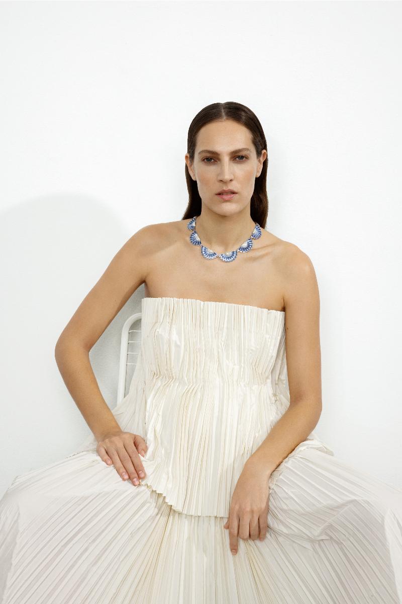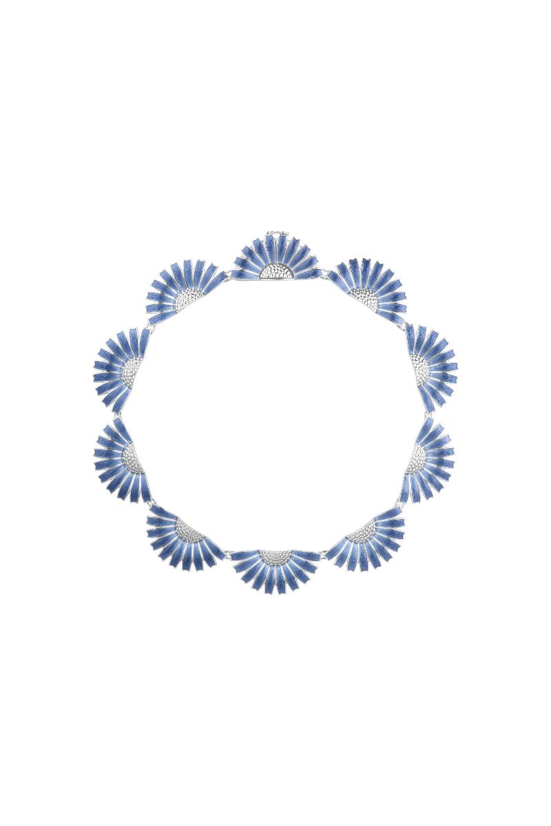 Dette statement-kjedet i blå emalje er helt nytt og er en unik tolkning av det ikoniske Daisy-motivet. Det dristige og iøynefallende stykket er formet med halve tusenfryd i sterling sølv og designet for å sitte vakkert rundt halsen. Halskjedet er en del av Daisy-kolleksjonen som opprinnelig var inspirert av en brosje fra 1940-tallet, formet som en tusenfryd, gitt til H.M. Dronning Margrethe II.