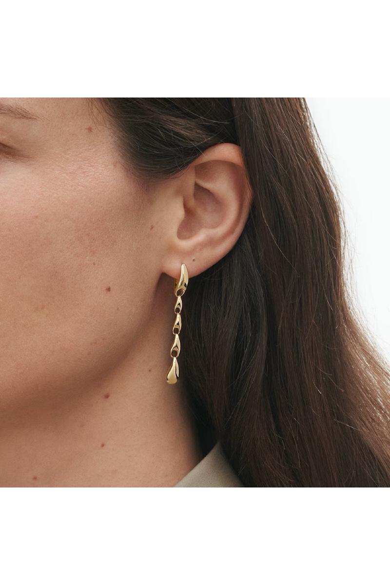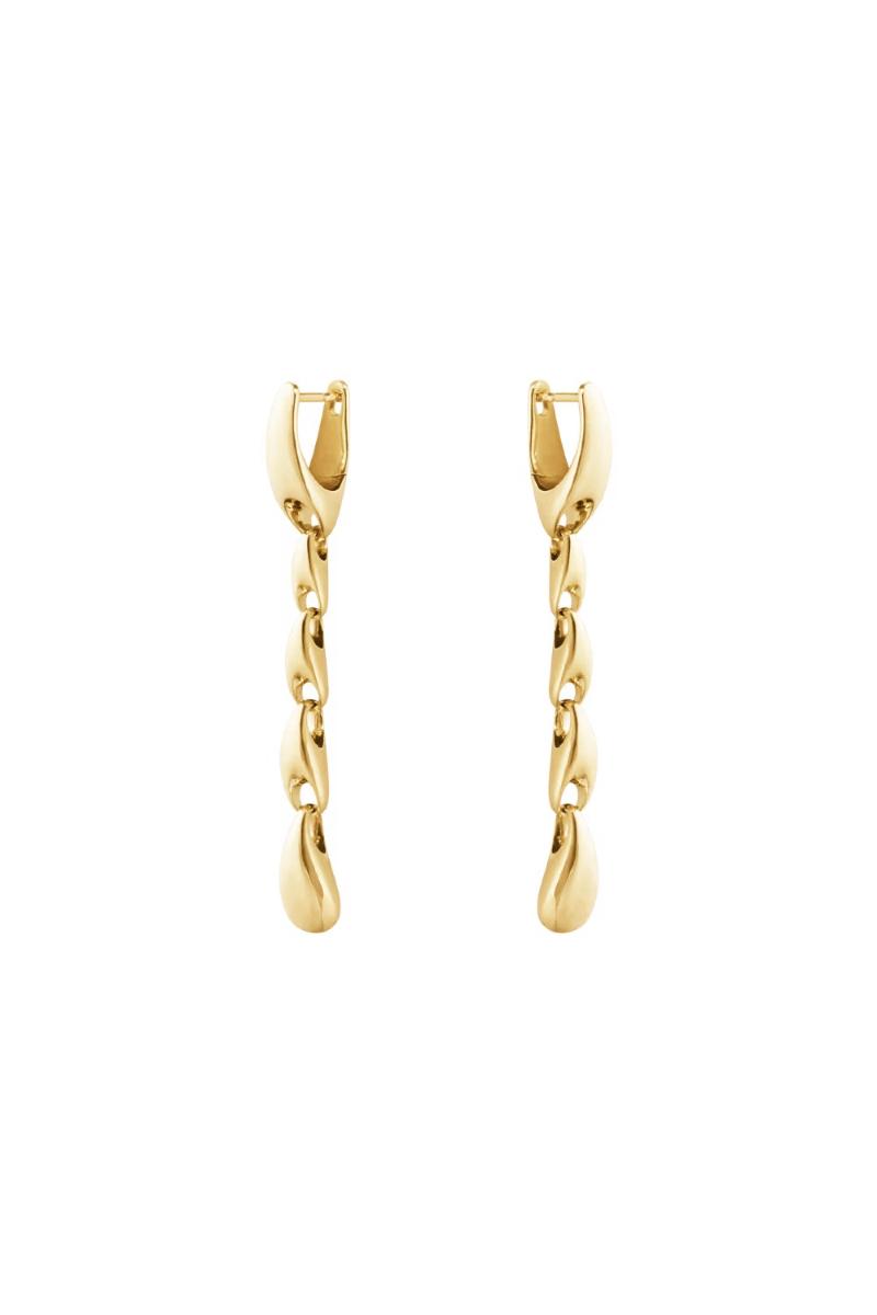 Disse skulpturelle øreringene i 18 karat gult gull er designet av Jacqueline Rabun – en av Georg Jensens mangeårige samarbeidspartnere. Designen er bygd opp av tre gulledd i naturlige former som henger fra en løkke og fullendes av et dråpeformet ledd nederst. Det er en markant design som setter et tøft preg på enhver stil.