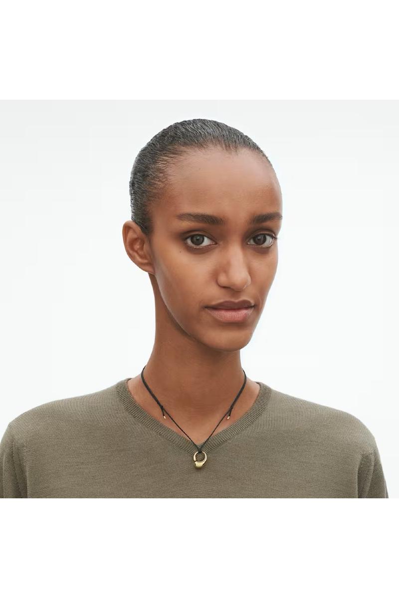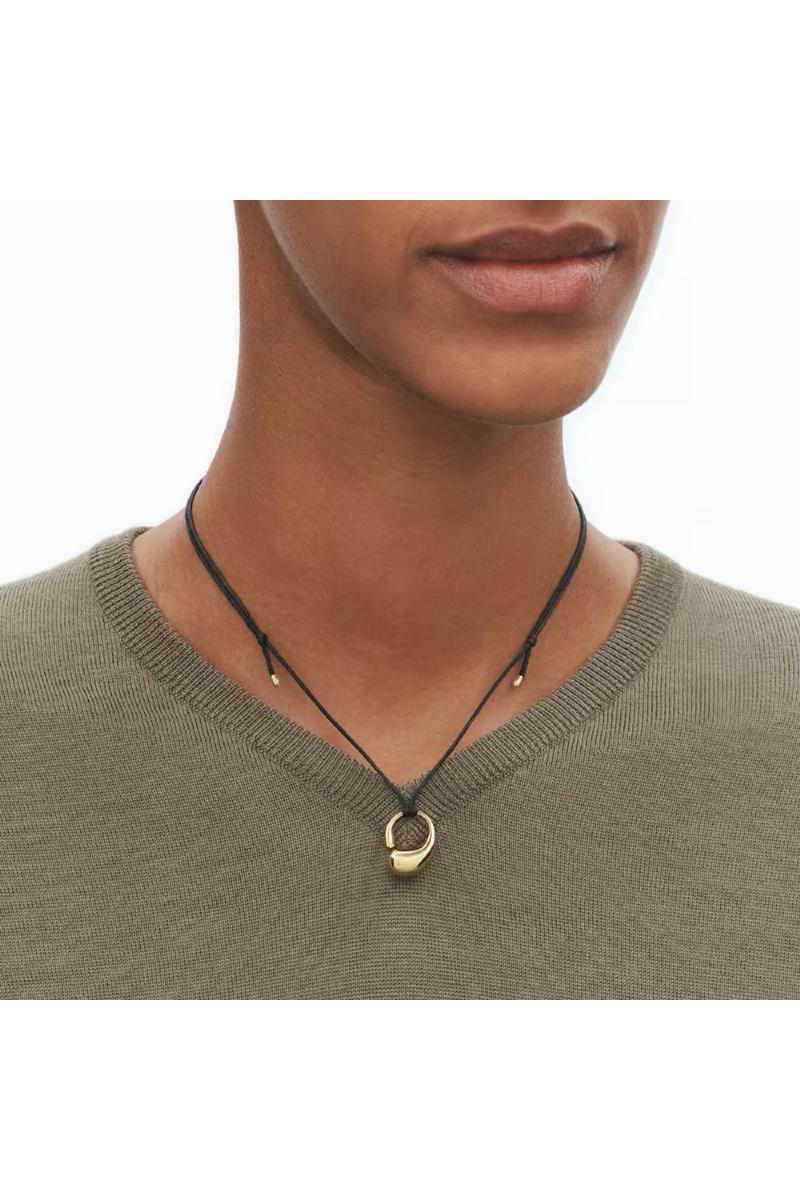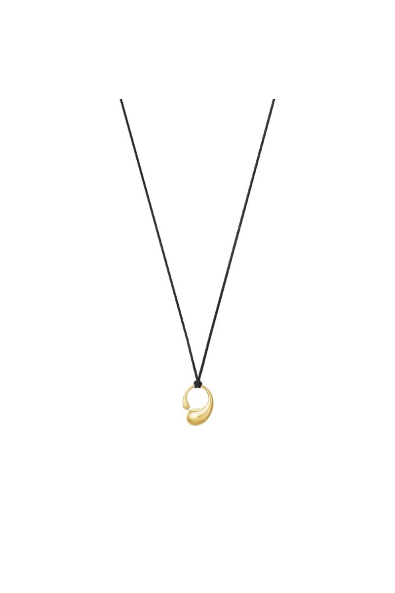 De myke, organiske linjene i Jacqueline Rabuns Mercy-ring tolkes i dette anhenget i 18 karat gult gull. Anhenget bæres i en vokset bomullssnor med ender i gult gull for et elegant uttrykk. Mercy-kolleksjonen ble lansert i 2019 og har en dyp symbolikk. Serien henter inspirasjon til de skulpturelle smykkene i timeglassets form og blir et symbol på tiden som går.