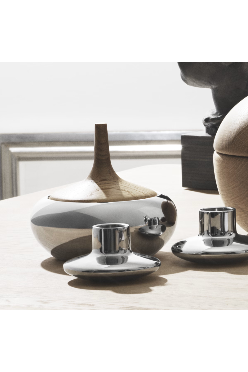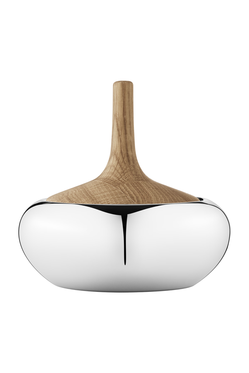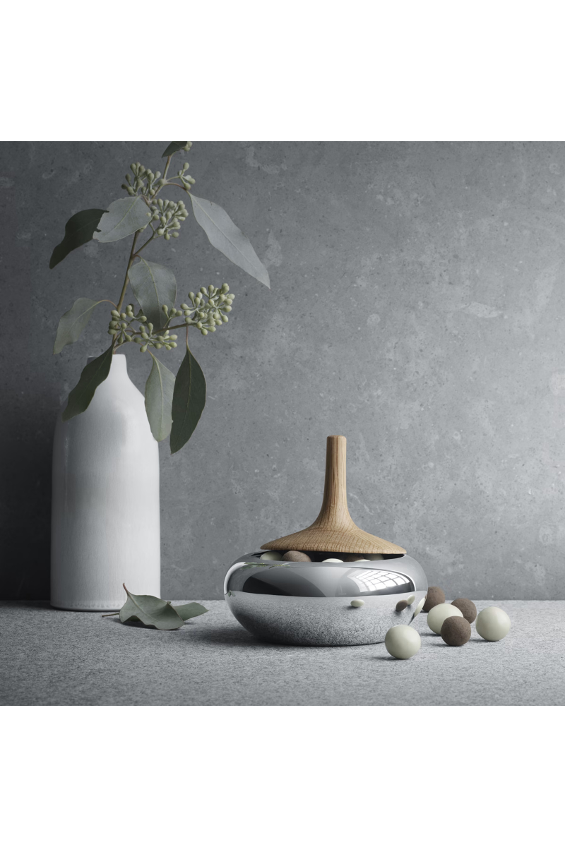 Inspirasjonen til denne godteriboksen ble hentet fra Henning Koppels serie av sølvgodteribokser fra 1960-tallet. Boksen var opprinnelig tenkt utført i mørkt tre og sølv, men med kombinasjonen av kjølig rustfritt stål og varmt eiketre ble Henning Koppels design vekket til live med et fantastisk moderne utseende. Bruk den til å oppbevare dine verdifulle eiendeler eller til godteri.