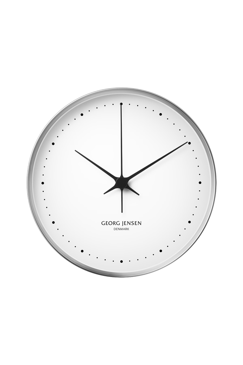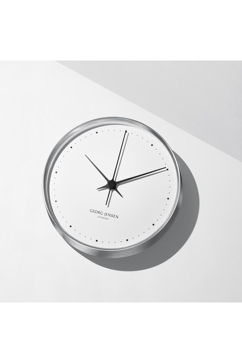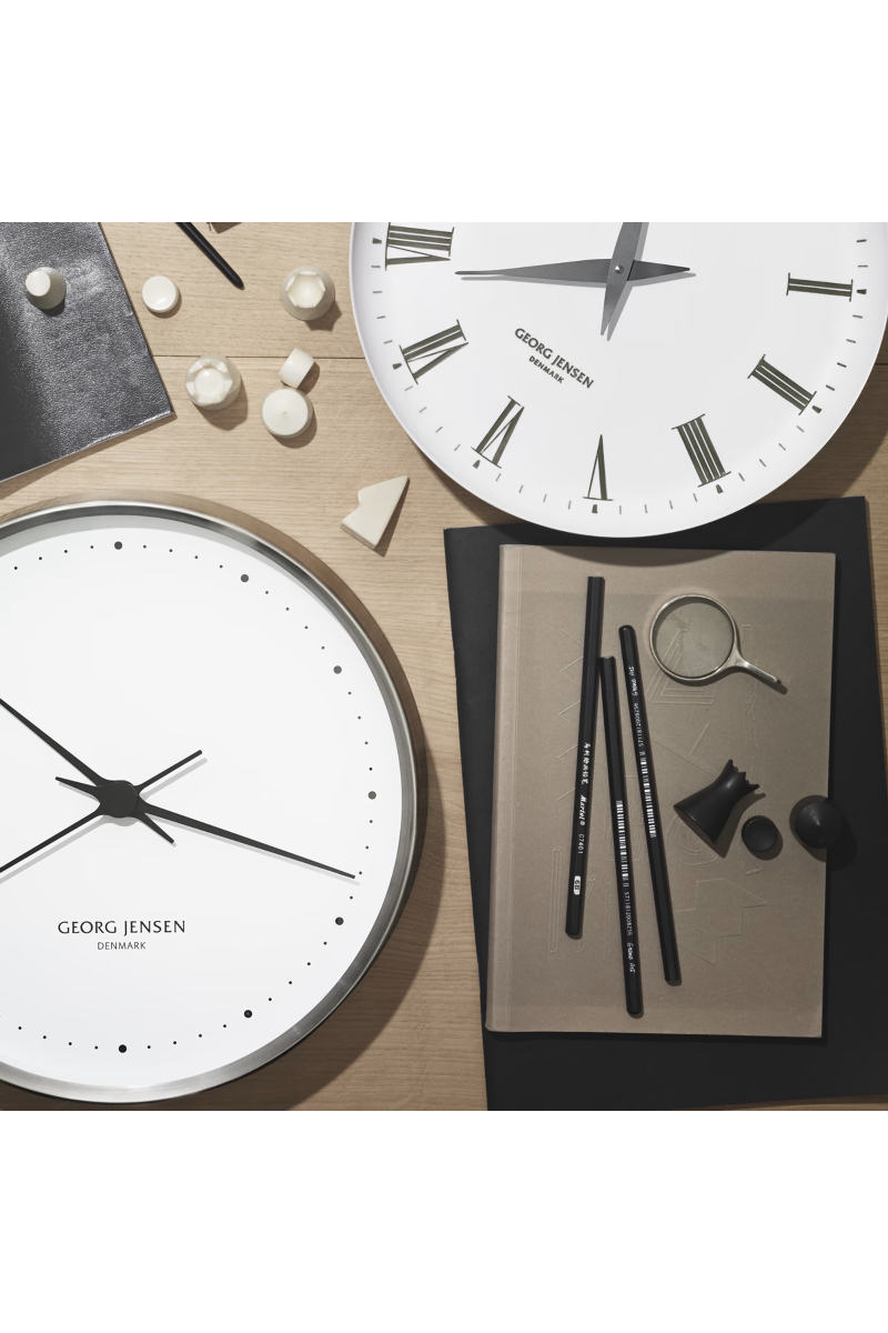 Koppels hvite ur har en moderne og stram estetikk – en stilistisk videreutvikling av melaminuret. Viserne går gjennom midten, og sirkler som markerer timene og minuttene, erstatter de mer tradisjonelle romertallene.